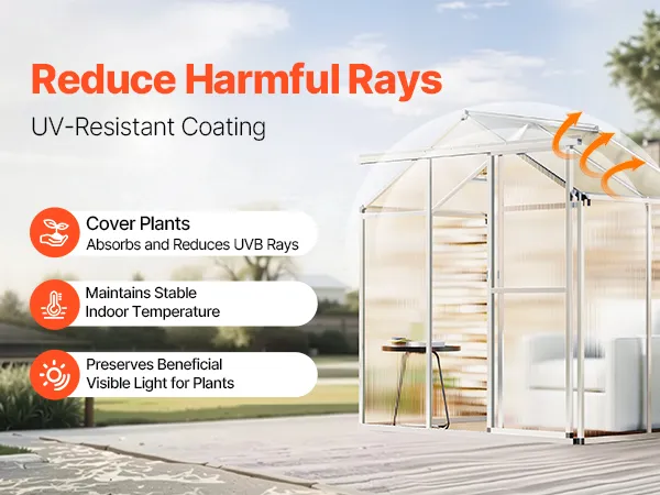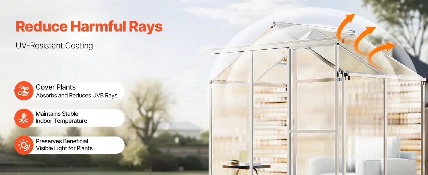 The PC panels of the polycarbonate greenhouse is equipped with an efficient anti-ultraviolet coating to protect your plants from ultraviolet radiation. The coating keeps beneficial visible light for plants and prevents excessive UV light to ensure a healthy and safe growing environment for plants.