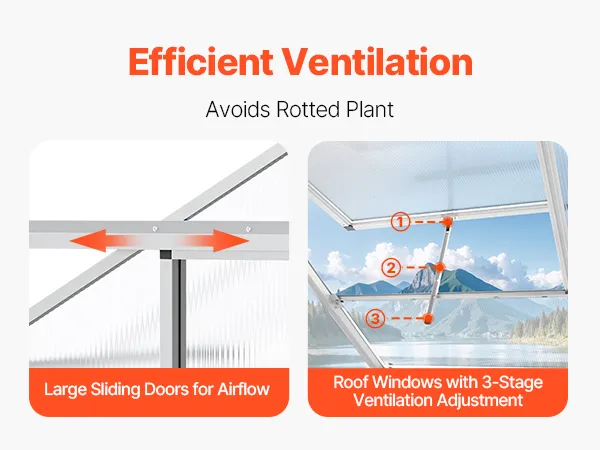The scientific ventilation system in the greenhouse ensures smooth air circulation through large sliding doors and 3-stage adjustable roof ventilation openings. This helps avoid high temperatures or excessive humidity that can cause plant rot.