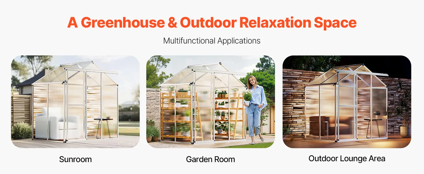 Our polycarbonate greenhouse is not just a space for plant growth. It can also be used as a sunroom, garden room, or outdoor leisure area. The spacious interior is suitable for placing various planting equipment, and can also provide you with an outdoor area for relaxation and enjoyment of nature.