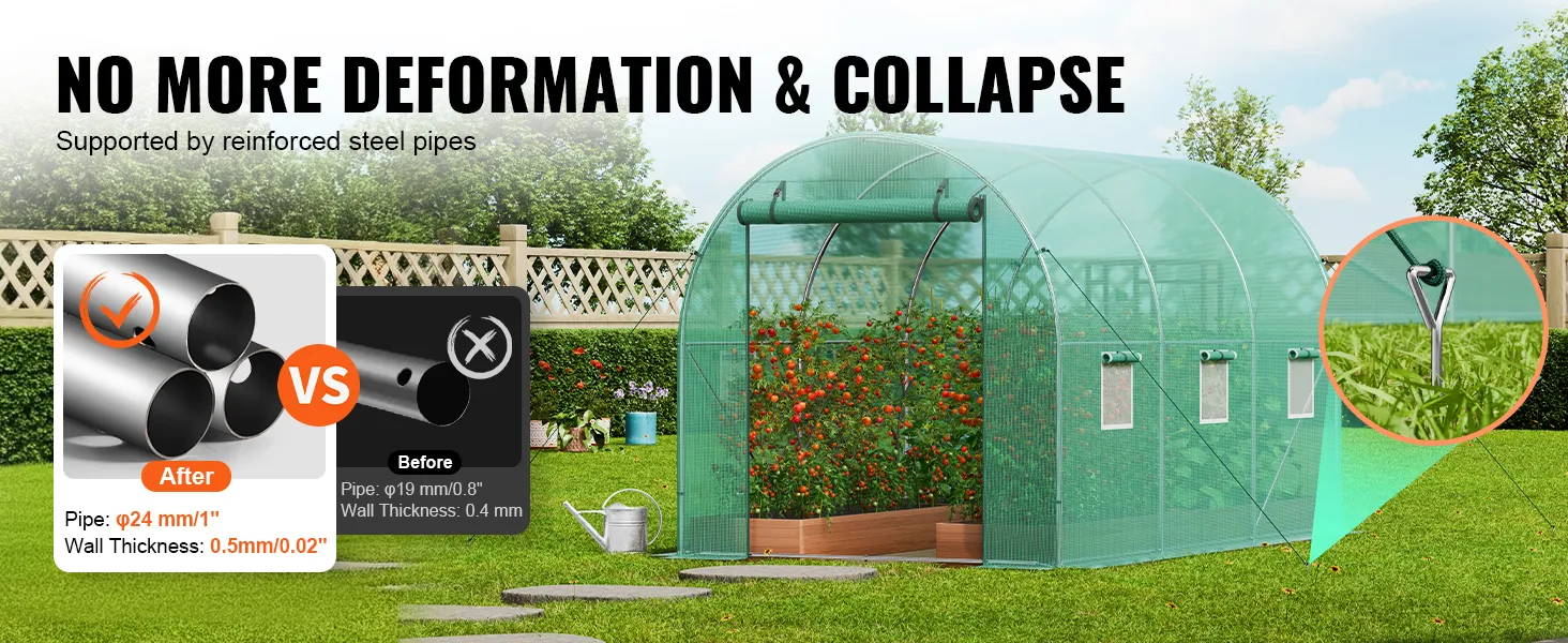 Verbeterd Heavy Duty gegalvaniseerd frame: De steunpalen van deze tunnelkas zijn gemaakt van versterkte gegalvaniseerde buizen (diameter: 1 inch / 25,4 mm, wanddikte: 0,02 inch / 0,5 mm), wat de algehele sterkte en stabiliteit verbetert. Versterkte deurstangen, extra diagonale stangen, U-vormige palen en spanbanden verhogen de stabiliteit en beschermen uw planten tegen barre weersomstandigheden.