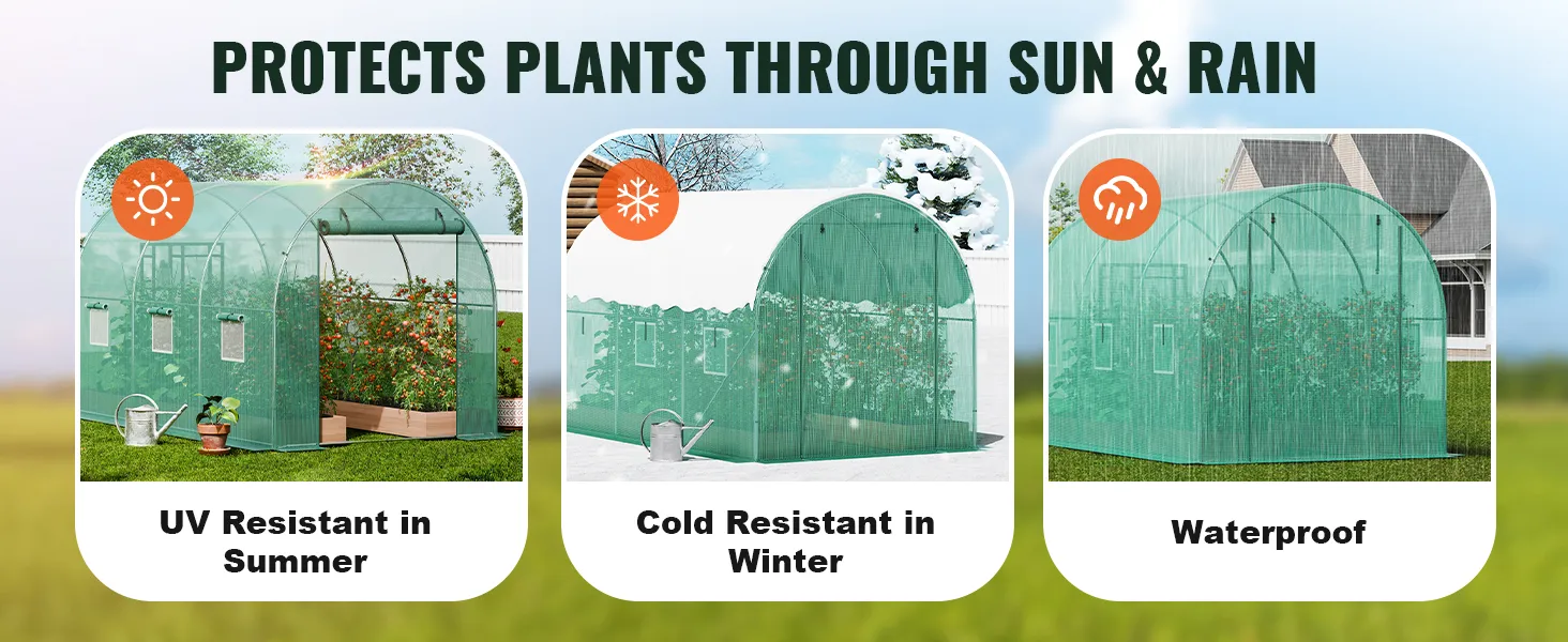 De PE-hoes biedt niet alleen bescherming tegen de zon, maar zorgt ook voor warmte en waterdichtheid in de winter. De dubbel gestikte naden van de inloopkastunnel zorgen voor duurzaamheid en bieden uw planten betrouwbare bescherming.