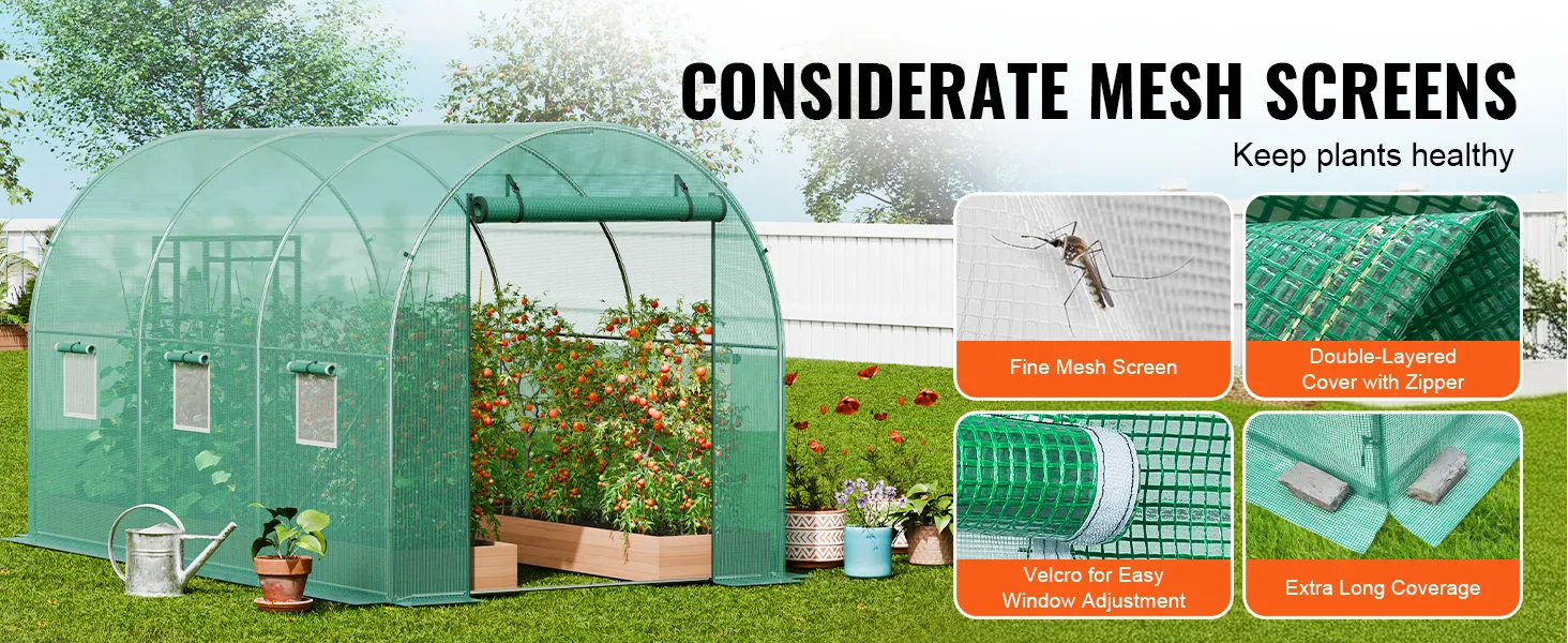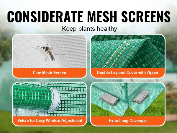 Deze kas is voorzien van gaasramen die voorkomen dat kleine beestjes binnenkomen. De dubbellaagse hoes beschermt de ritssluiting en de klittenbandvensters maken eenvoudige aanpassingen mogelijk, zorgen voor uitstekende ventilatie en beschermen de plantgezondheid.