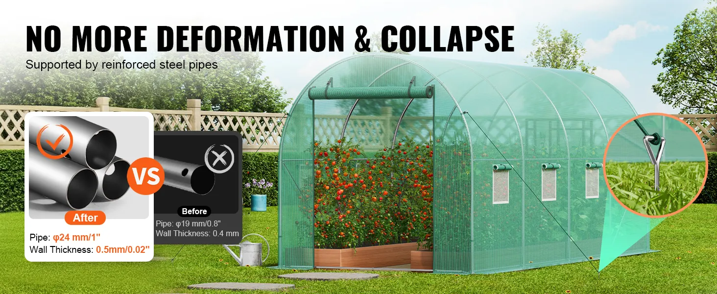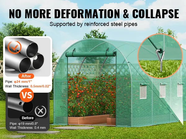 The upgraded 24mm/1" thickened steel pipes with a 0.5mm/0.02" wall thickness, combined with U-shaped stakes and plastic hooks, ensure a more stable greenhouse structure. The high tunnel greenhouse easily withstands severe weather, preventing deformation and collapse.