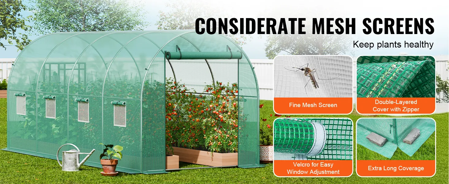 Efficient Ventilation Design: This hoop house greenhouse is equipped with 8 windows and a large zipper door for improved airflow. The velcro and mesh net design helps keep small creatures out while maintaining ventilation, ensuring a healthy growing environment for your plants.