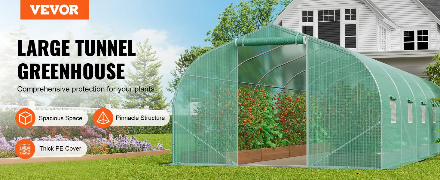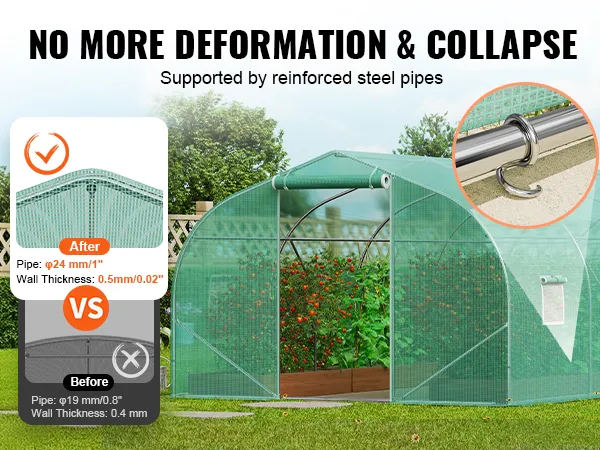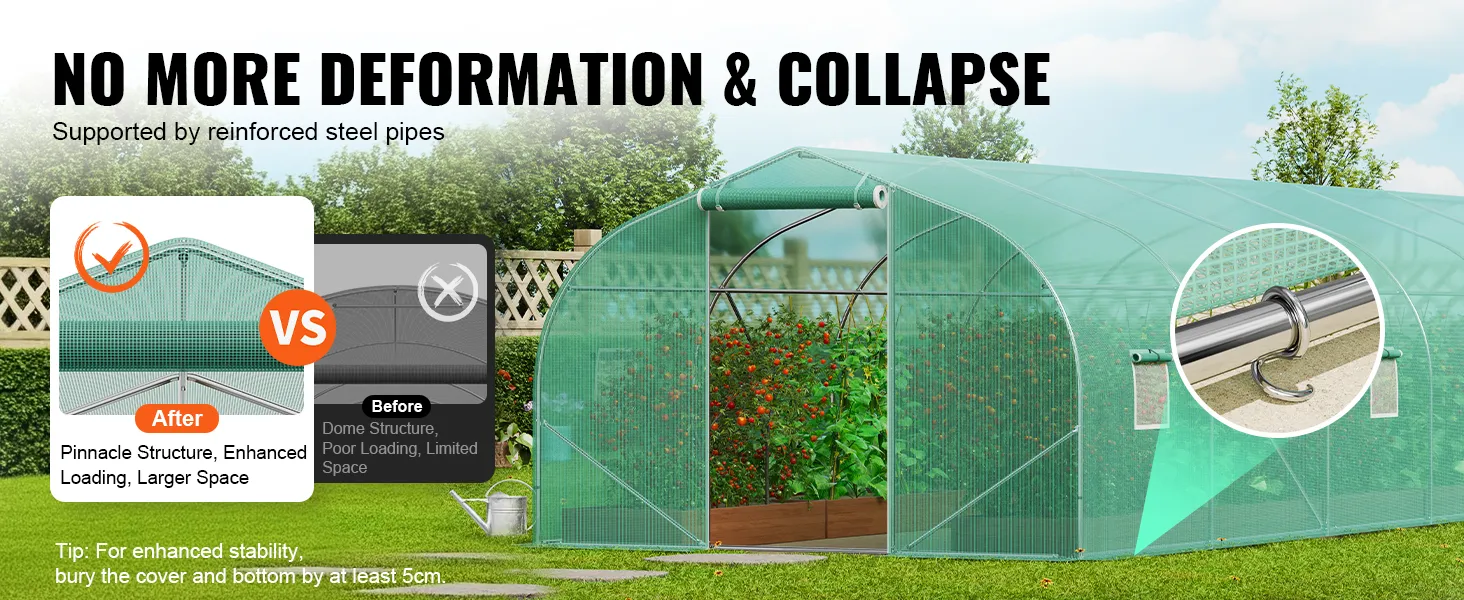 Verbeterd stevig gegalvaniseerd frame: De tunnelkas is voorzien van een schuine kapconstructie, waardoor niet alleen het draagvermogen wordt vergroot, maar ook sneeuw- en waterophoping effectief wordt voorkomen. Versterkte deurstangen, extra diagonale stangen, U-vormige rongen en spanbanden verhogen de stabiliteit en beschermen uw planten tegen regen, sneeuw en harde wind.