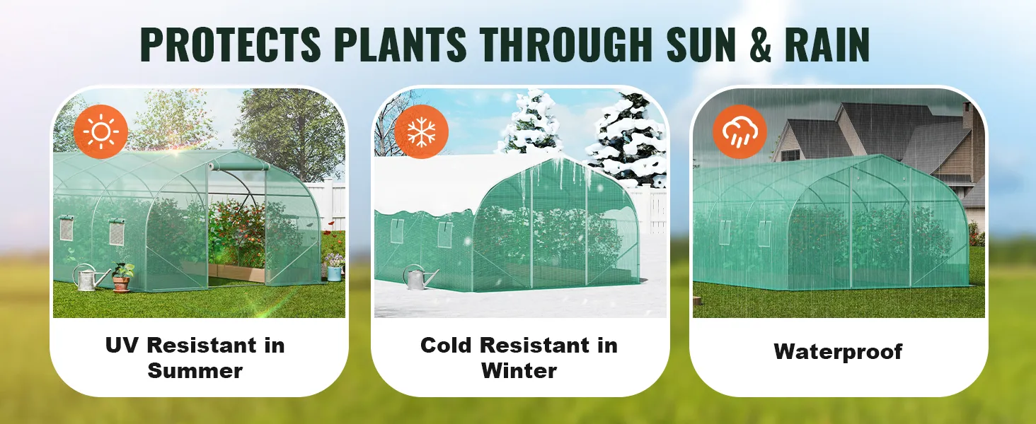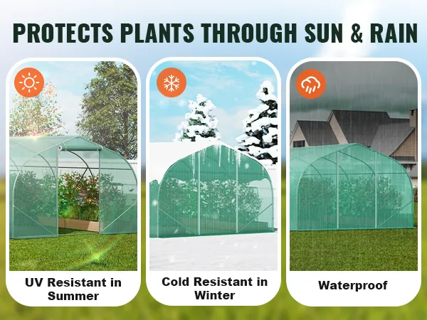 De PE-hoes biedt niet alleen bescherming tegen de zon, maar zorgt ook voor warmte en waterdichtheid in de winter. De dubbel gestikte naden van de inloopkastunnel zorgen voor duurzaamheid en bieden uw planten betrouwbare bescherming.