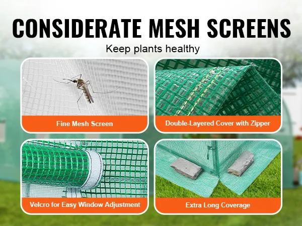 Deze kas is voorzien van gaasramen die voorkomen dat kleine beestjes binnenkomen. De dubbellaagse hoes beschermt de ritssluiting en de klittenbandvensters maken eenvoudige aanpassingen mogelijk, zorgen voor uitstekende ventilatie en beschermen de plantgezondheid.