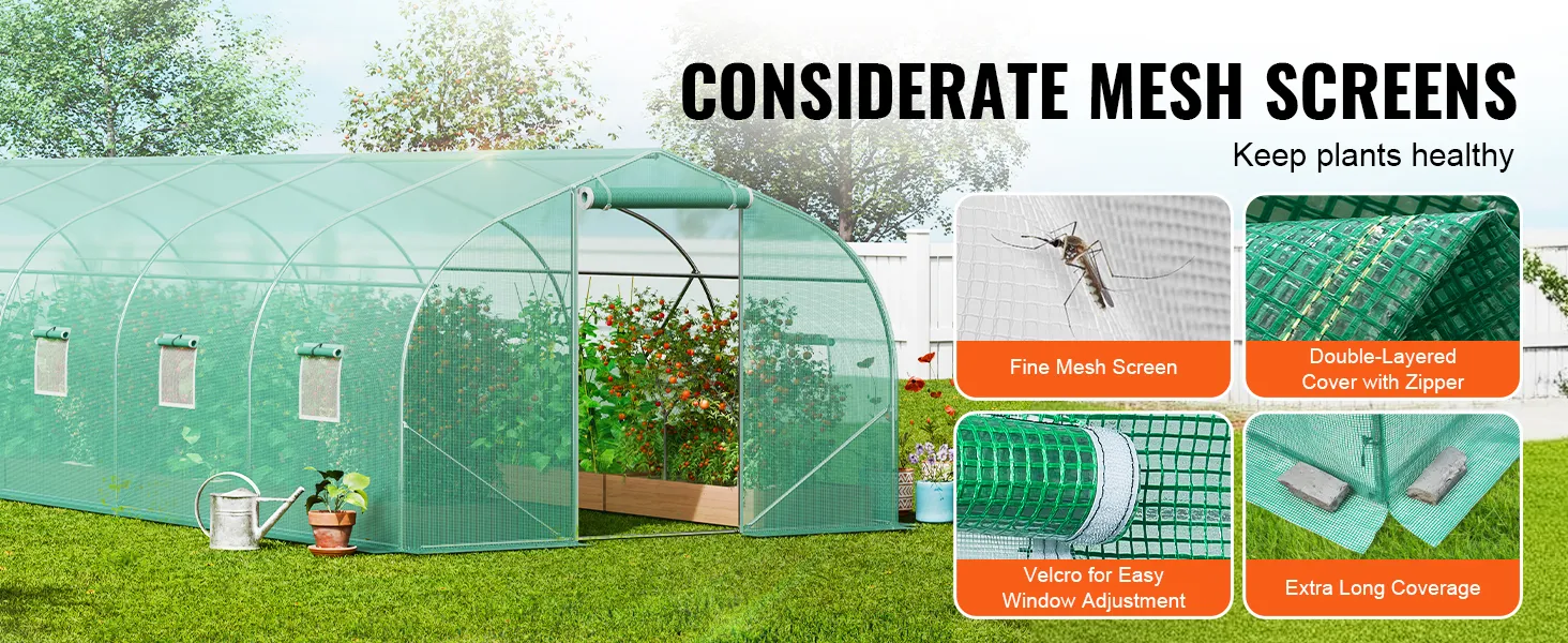 Efficiënt ventilatieontwerp: de foliekas heeft 12 ramen en een grote zijdeur voor optimale luchtcirculatie. Klittenbandsluitingen op de deur en ramen zorgen voor eenvoudige aanpassingen en het gaas houdt kleine beestjes buiten, waardoor een gezonde groeiomgeving voor uw planten wordt gegarandeerd.