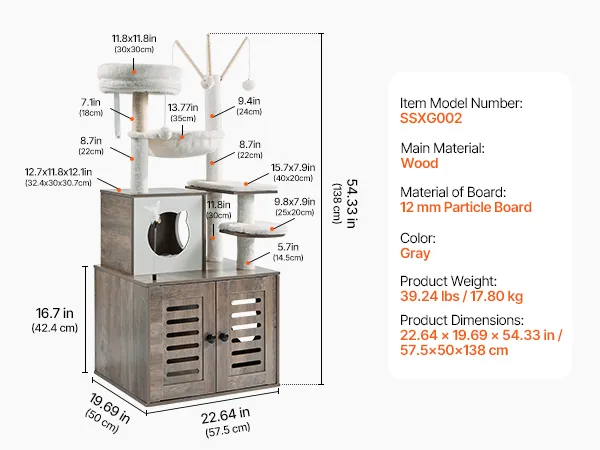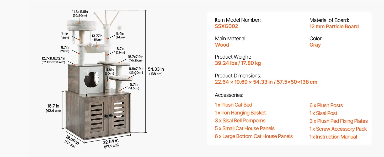 • Multi-Functional Cat Condo: Say goodbye to clutter! This 2-in-1 cat tree combines a litter box enclosure with a multi-level cat climbing tower, providing your cat with a private space and a fun play area. The litter box enclosure helps reduce unwanted smells and scattered litter, keeping your home clean and elegant. Compatible with litter boxes sized 21.46 x 18.90 x 15.35 in / 54.5 x 48 x 39 cm.