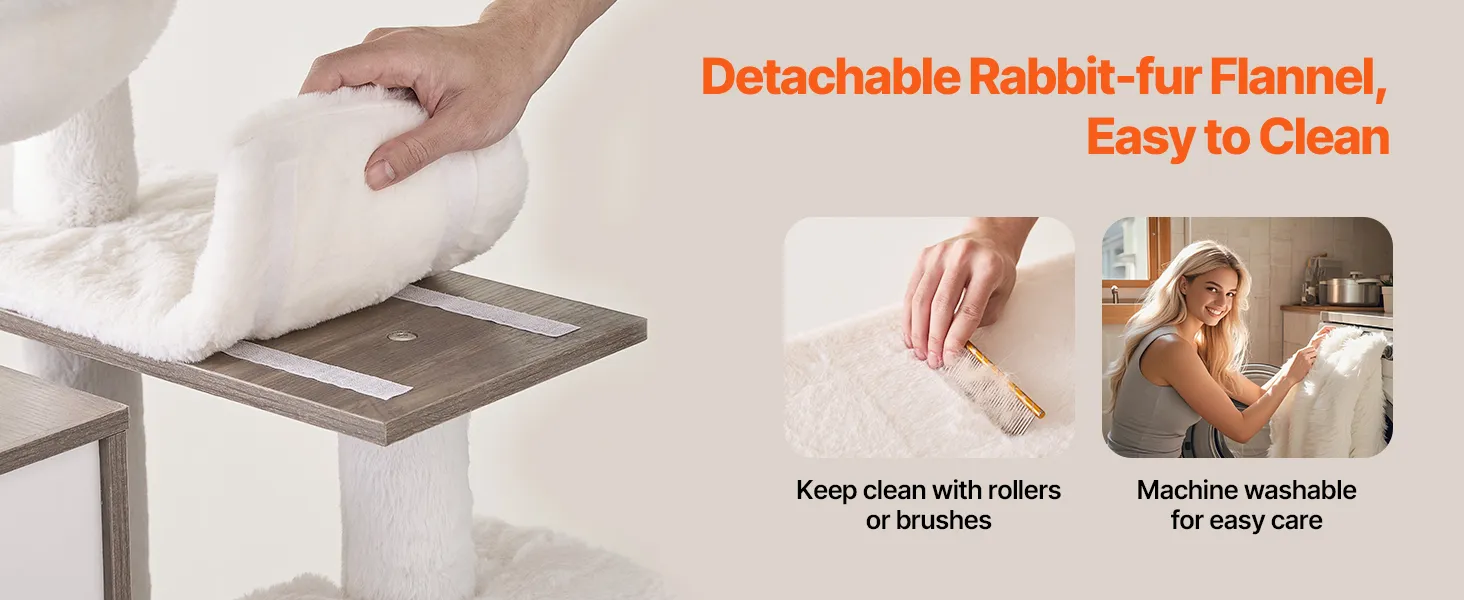 Our cat condo features soft faux rabbit fur pads that are easy to detach and wash. Whether it’s to keep your cat cool in summer or just for regular cleaning, the cushions are designed for hassle-free maintenance. Use a lint roller or machine wash to keep things fresh.