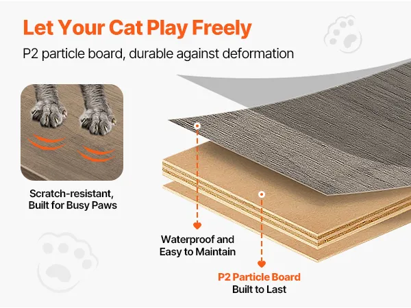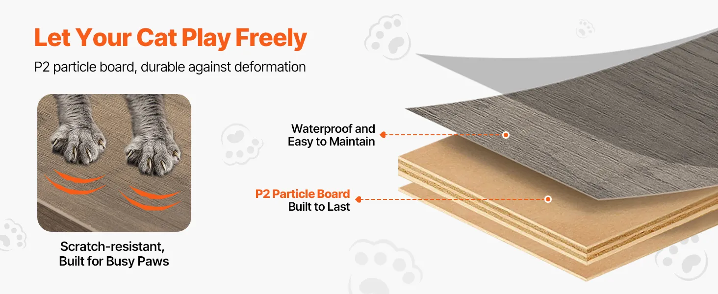 Built with high-quality P2-grade particleboard, this cat tree is sturdy, durable, and scratch-resistant. It’s great for energetic cats and won’t easily lose its shape. Plus, the surface is waterproof and easy to wipe clean, so your furniture stays looking new.