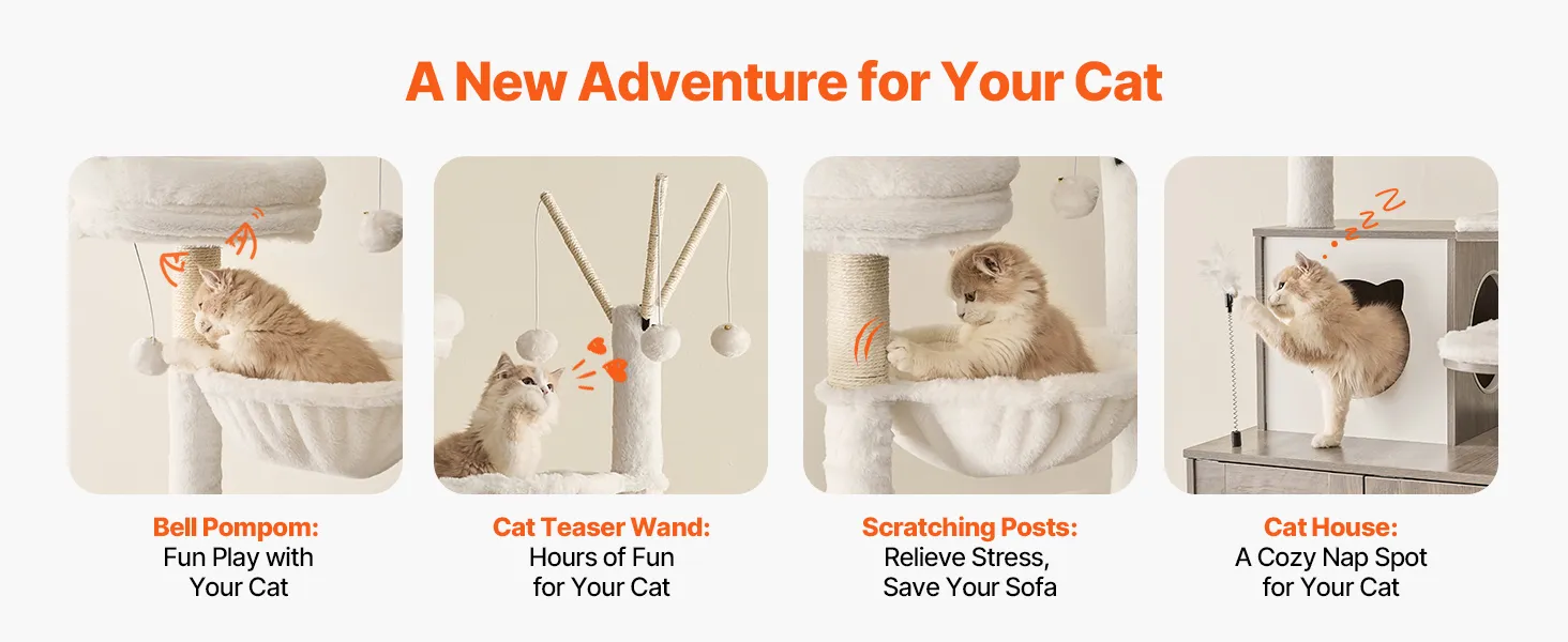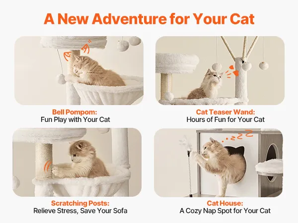 This cat tower includes fun toys like a dangling ball and a teaser stick to spark your cat's curiosity and playfulness. The natural sisal posts satisfy their scratching instincts, while the multi-level design provides endless opportunities for climbing, jumping, and lounging.