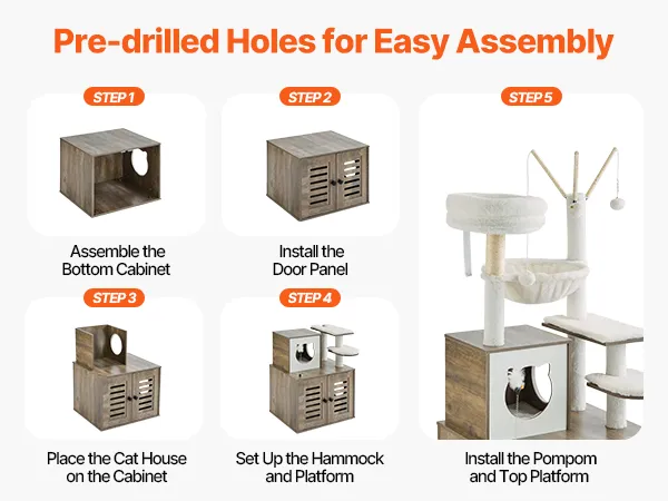 • Quick Setup, Instant Fun: Setting up your cat tree has never been easier. With pre-drilled holes and all the tools included, you'll have your cat’s new playground ready in no time. Get your furry friend’s space set up quickly, and let them start exploring their new multi-level condo.