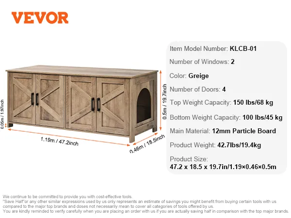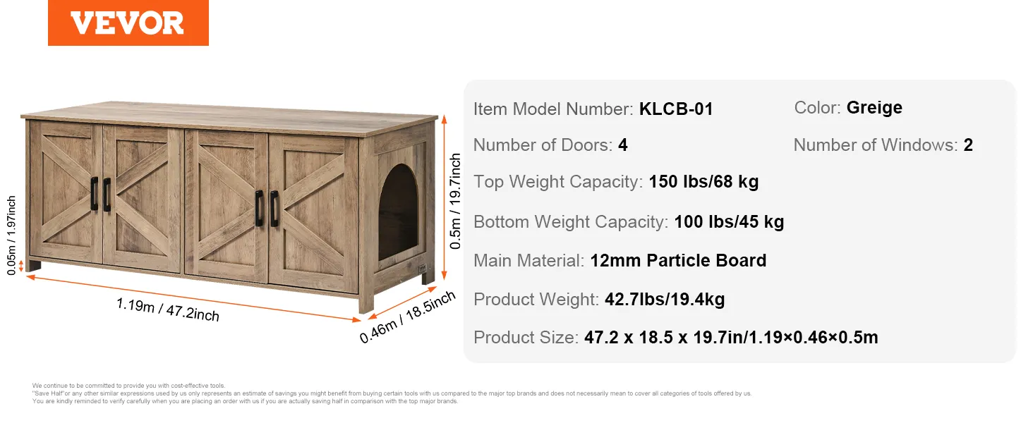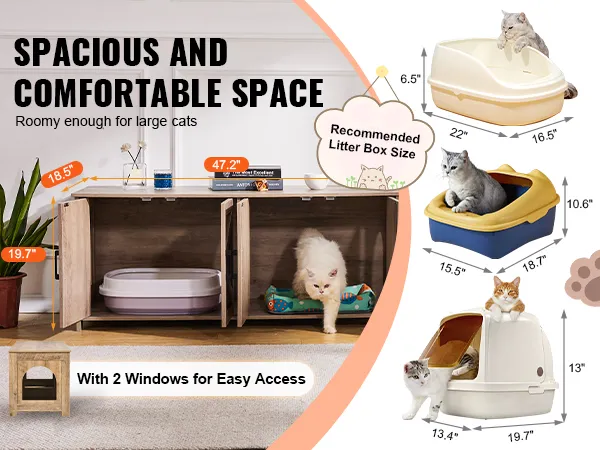 Spacious Space: Measuring 47.2x18.5x19.7in, this cat litter box furniture provides a comfortable and free resting space for pets. It can accommodate cat litter boxes with a length of less than 21" and a width of less than 17.7". It is equipped with 4 doors and 2 windows for cats' easy access freely.