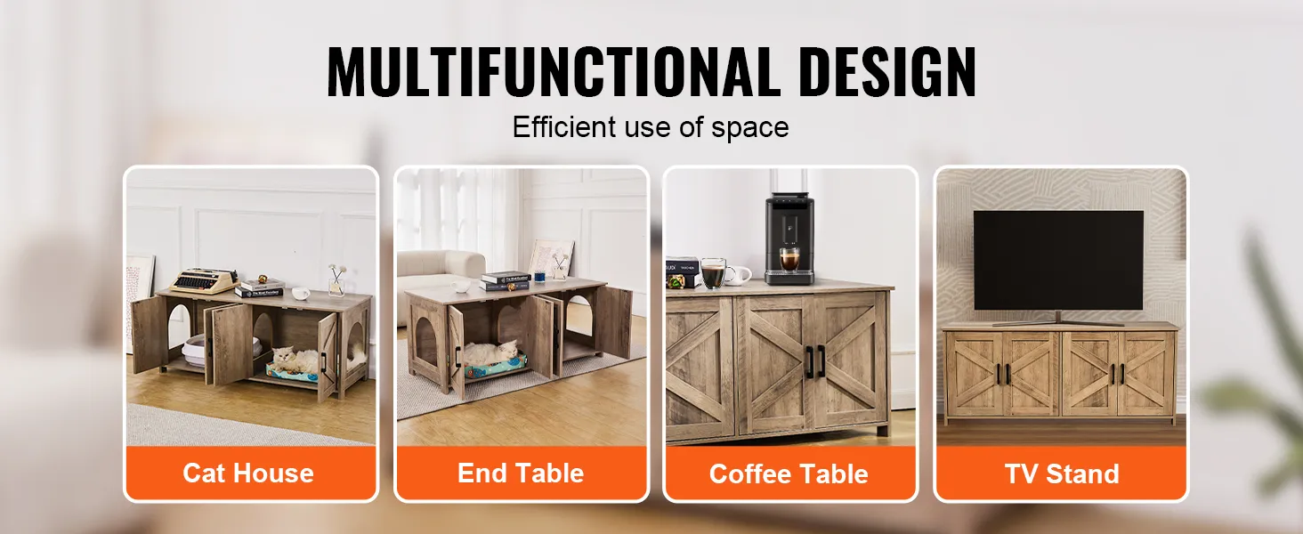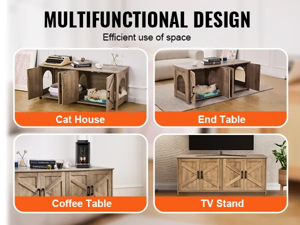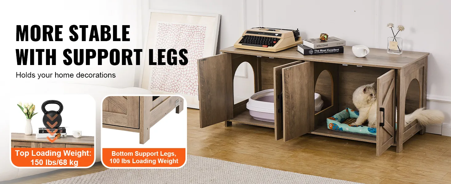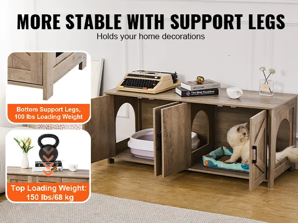 With a top weight capacity of 150lb/68kg, the cat litter cabinet can easily hold books, flowers, ornaments and other decorations. With additional support feet, the weight capacity is 100lb/45kg. It not only stores a large cat litter box, but also easily transforms into a cozy cat house.