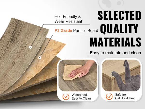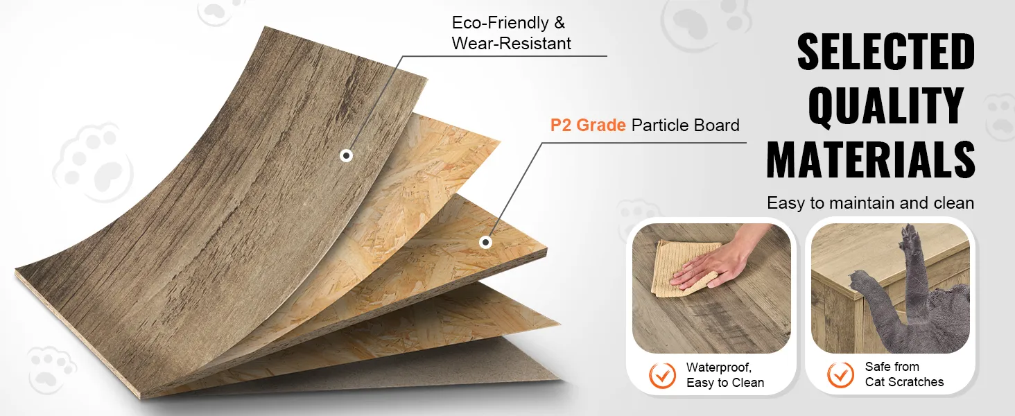 Made of P2 grade particle board, it is durable, ensuring the health of you and your pets. The high-quality finish is waterproof, and not easy to be damaged by cat scratching. Even cat urine or other stains can be easily wiped clean, greatly simplifying daily maintenance.