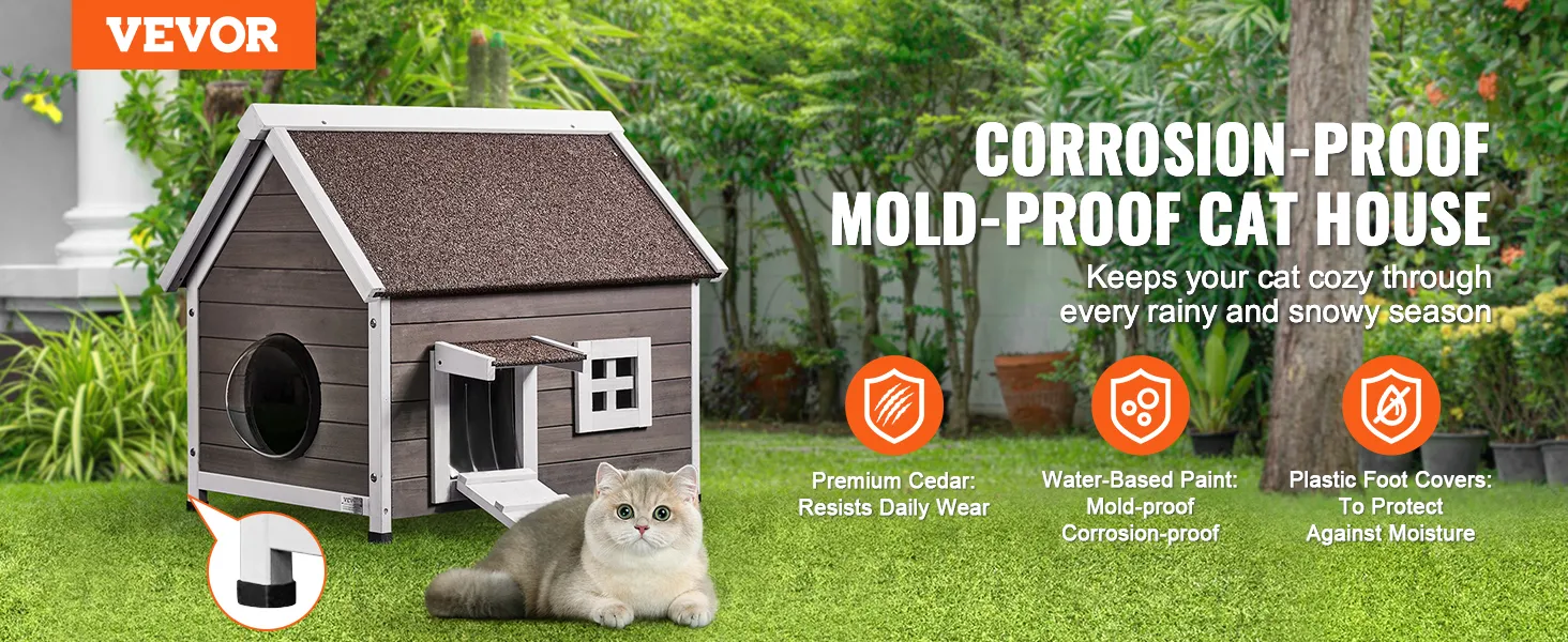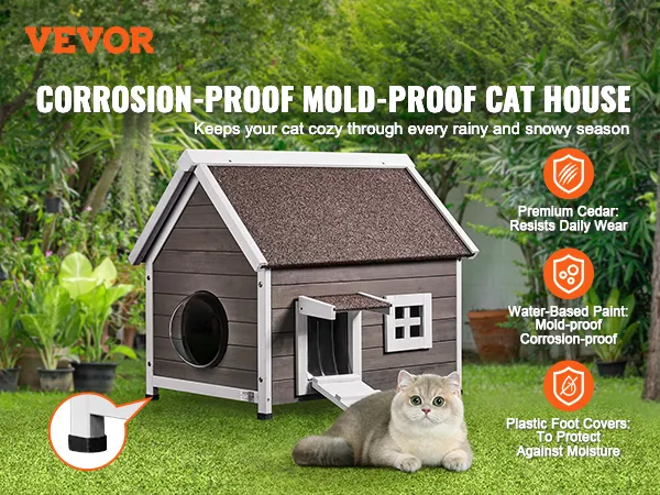 Made from high-quality fir wood and coated with water-based paint, this outdoor cat house offers multi-layer protection, which is corrosion-proof. Four waterproof foot pads enhance waterproof features. Ensure your cat's safety and health!