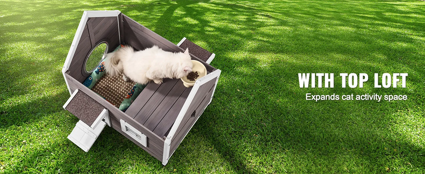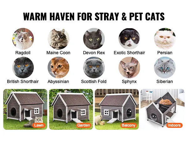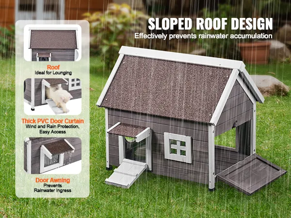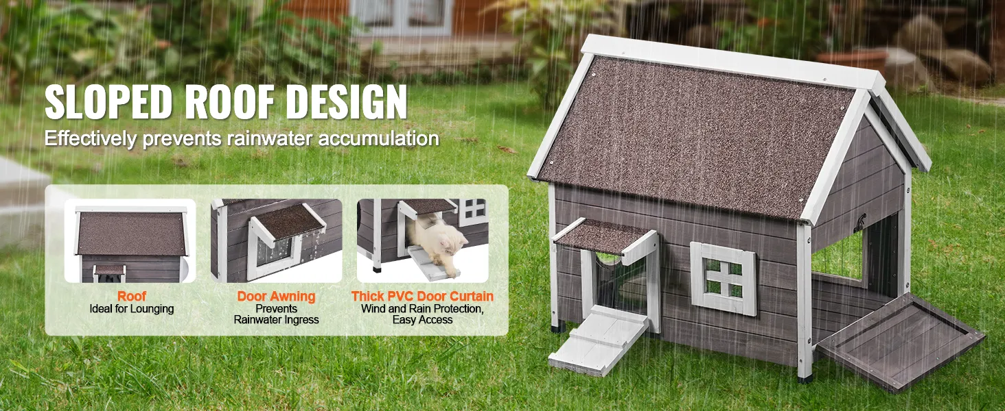 The sloped roof prevents water accumulation and provides a comfortable resting space for your cat. The rainproof eaves and thick PVC door curtains ensure protection from wind and rain while allowing for easy access.