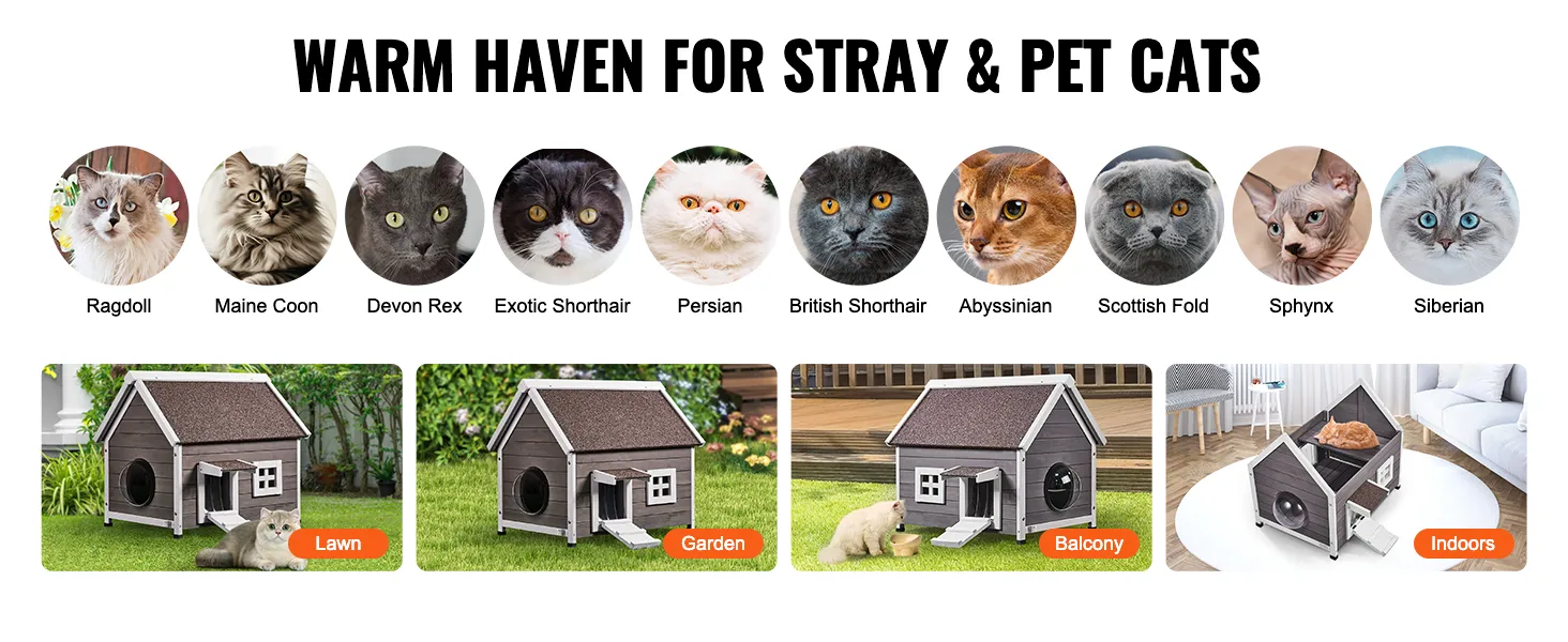 This wooden cat house is suitable for both indoor and outdoor settings. Ideal for lawn, garden, balcony, and yard, it provides a cozy space for your cat to rest and play.