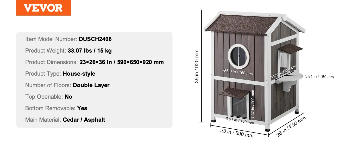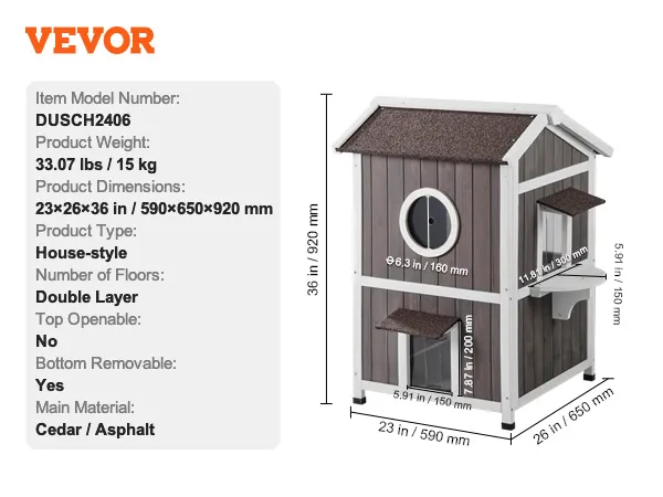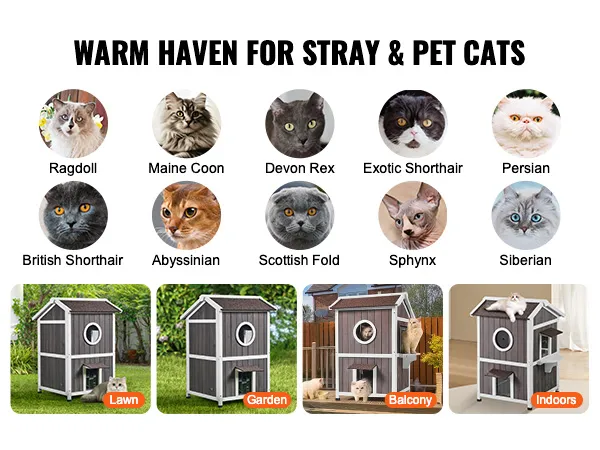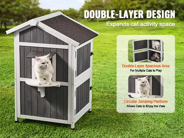 Comfortabel kattenhuis: dit kattenhuis voor buiten is gemaakt van hoogwaardig cederhout, duurzaam en bestand tegen scheuren of vervorming. Het is effectief bestand tegen slechte weersomstandigheden en biedt uw katachtige vriend een warm en gezellig huis.