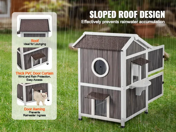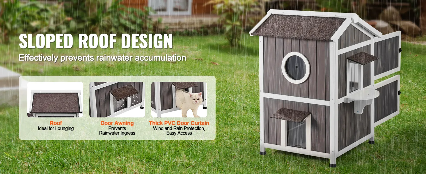 Het schuine dak voorkomt dat water zich ophoopt en biedt uw kat een comfortabele rustplaats. De regendichte dakrand en dikke PVC-deurgordijnen bieden bescherming tegen wind en regen en bieden tegelijkertijd gemakkelijke toegang.