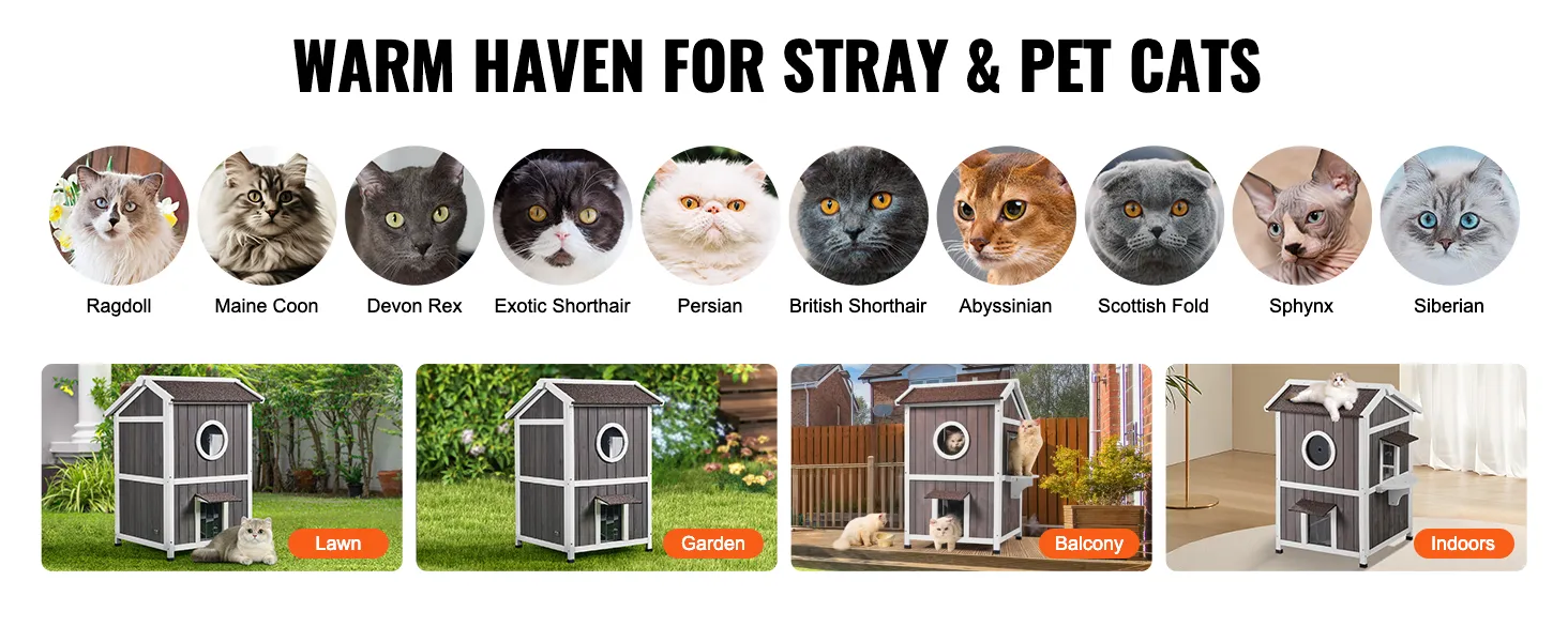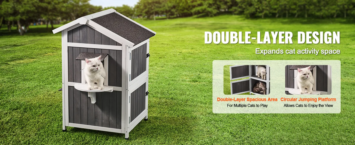 Dit houten kattenhuis is geschikt voor zowel binnen- als buitengebruik. Het is ideaal voor gazons, tuinen, balkons en binnenplaatsen en biedt uw kat een comfortabele plek om te rusten en te spelen.