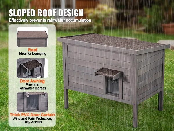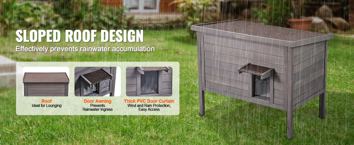 Het schuine dak voorkomt dat water zich ophoopt en biedt uw kat een comfortabele rustplaats. De regendichte dakrand en dikke PVC-deurgordijnen bieden bescherming tegen wind en regen en bieden tegelijkertijd gemakkelijke toegang.