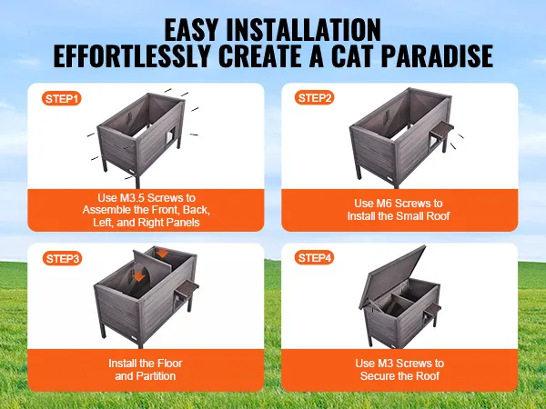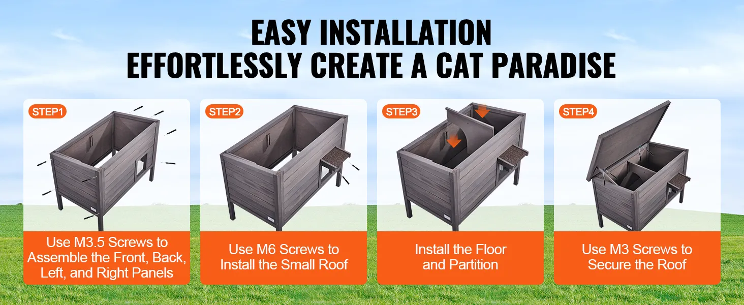 Ons wilde kattenhuis heeft voorgeboorde gaten voor eenvoudige montage met houtschroeven. Dit betekent dat er geen speciaal gereedschap nodig is en dat u tijd en moeite bespaart.