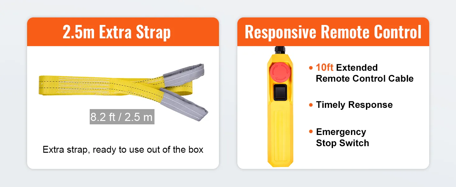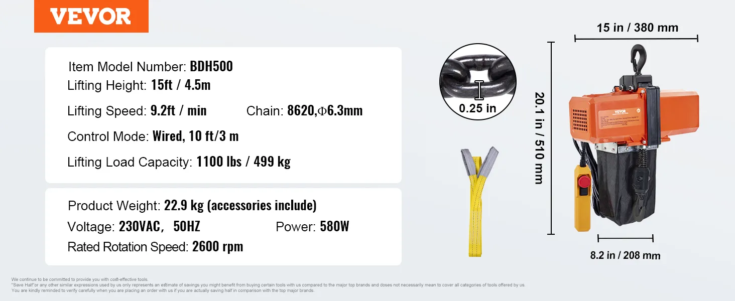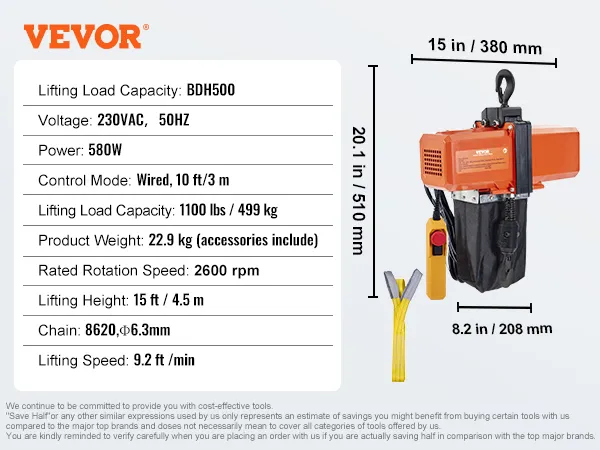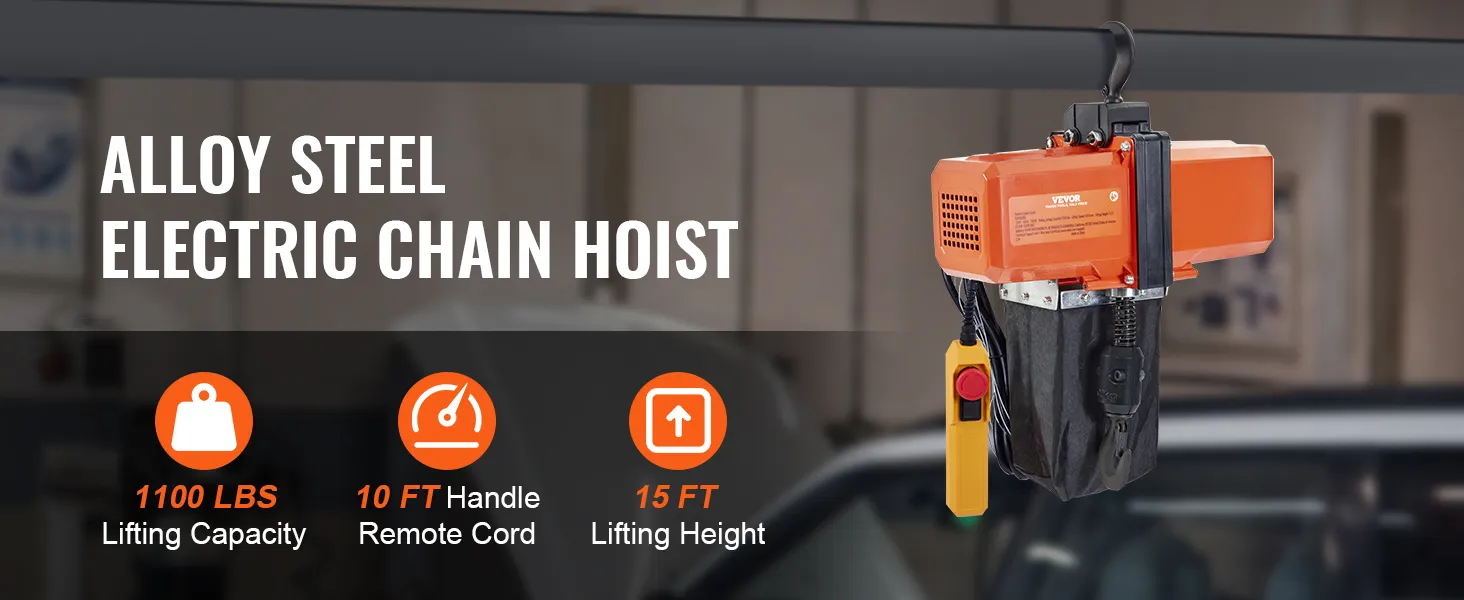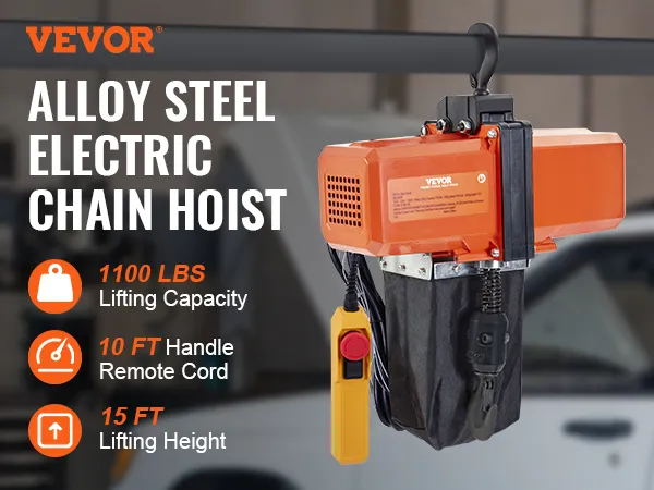499 kg draagvermogen: onze elektrische kettingtakel is uitgerust met een G100-ketting om een veilig draagvermogen van 499 kg te garanderen. Hij kan allerlei zware voorwerpen tillen met een snelheid van 2,8 m/min en een maximale hefhoogte van 4,5 m.