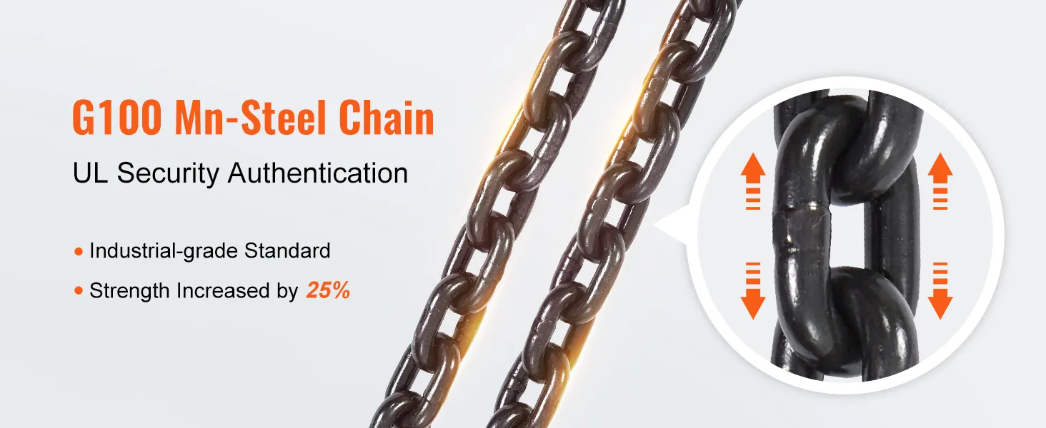 De robuuste ketting zorgt voor een lager totaalgewicht en een grotere sterkte van de elektrische kettingtakel. Hij kan zware lasten dragen en is nog steeds comfortabel.