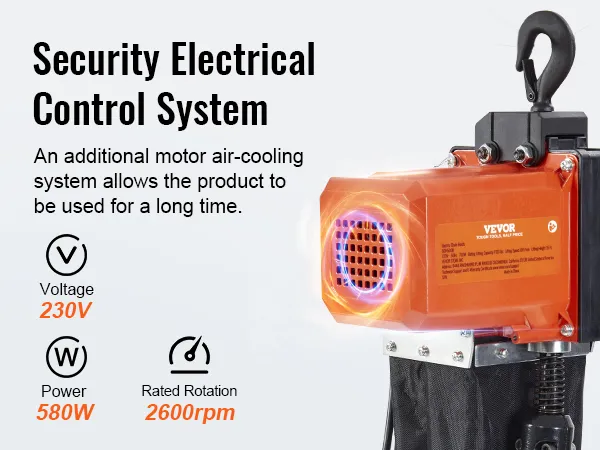 Krachtige motor: de koperen motor levert 580 W vermogen om zware lasten aan te kunnen zonder vervorming. De grote radiateurventilator houdt de elektrische kettingtakel koel en voorkomt oververhitting. Al deze functies zorgen voor efficiënt werken en besparen u meer tijd en energie.