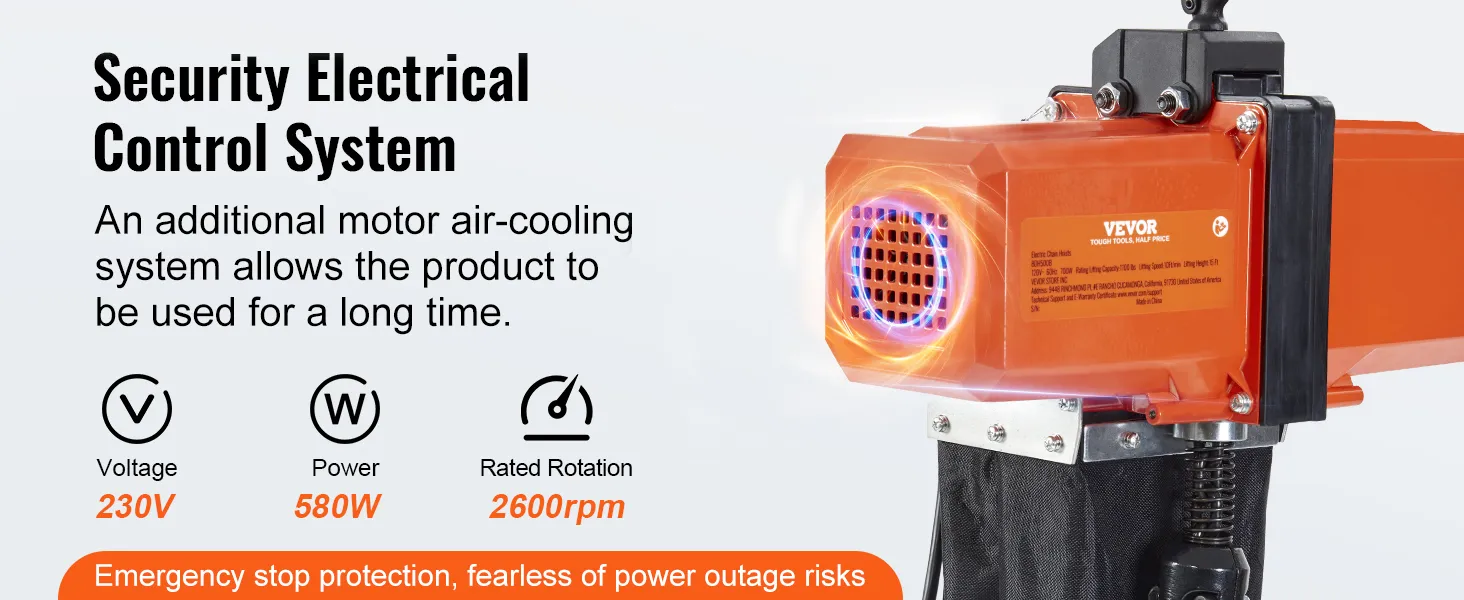 De efficiënte kopermotor zorgt voor het stabiel en veilig tillen van zware voorwerpen. Met een noodremsysteem en een luchtkoelsysteem is de elektrische kettingtakel betrouwbaar en veilig in gebruik.
