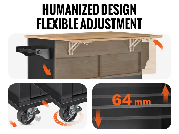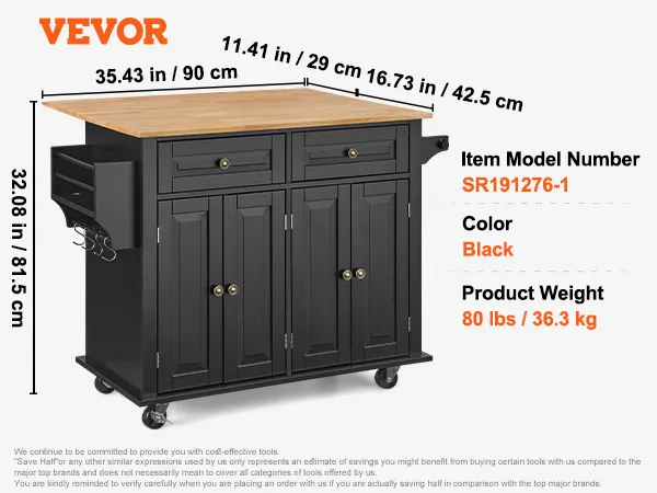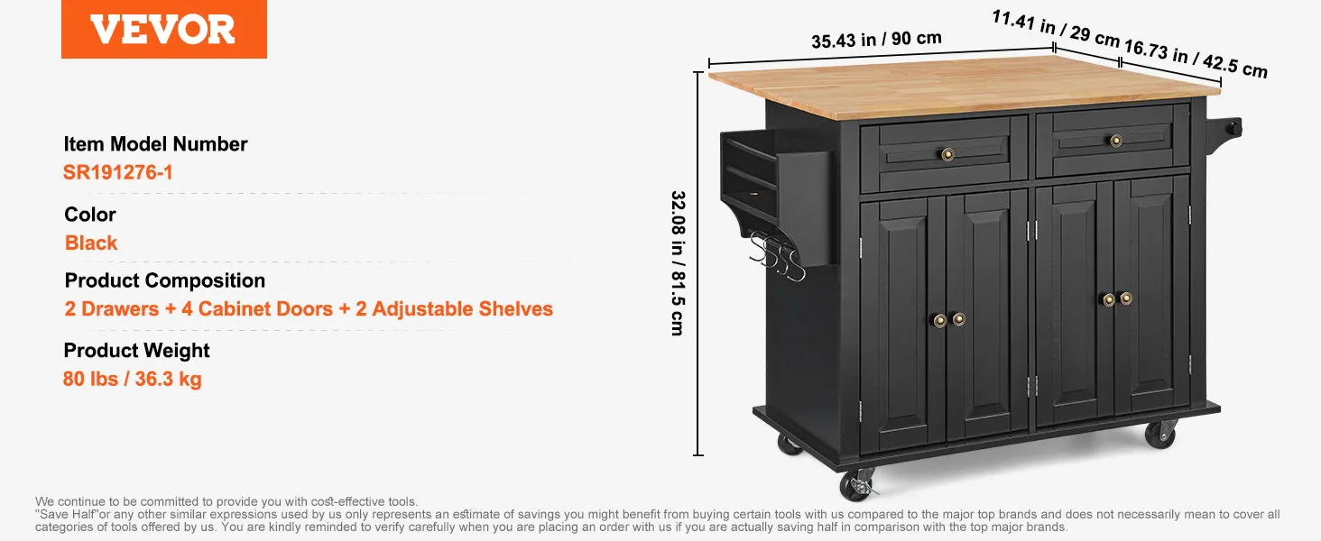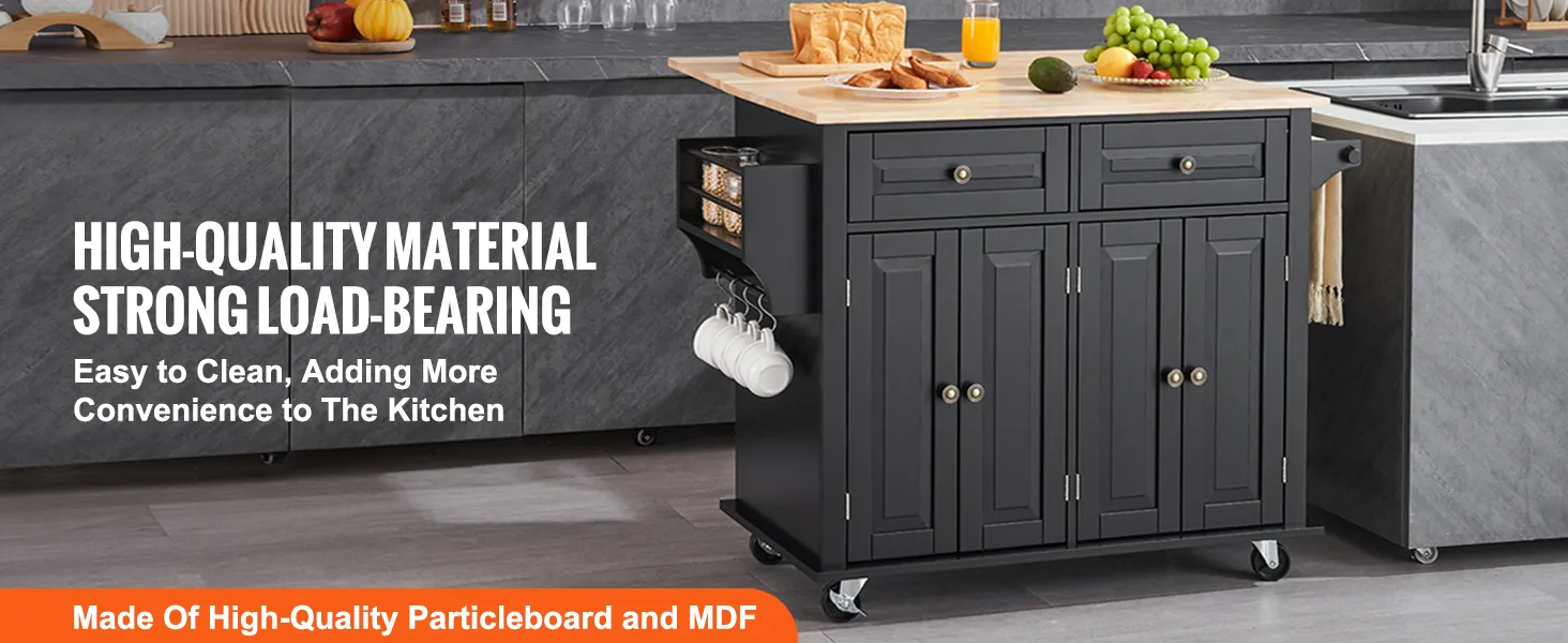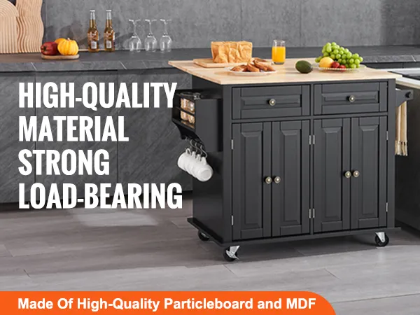 De VEVOR keukeneilandwagen heeft een bovenkant van hoogwaardig massief rubberhout en MDF. Deze combinatie maakt het oppervlak vlekbestendig en waterdicht. De duurzaamheid van het materiaal zorgt ervoor dat de wagen bestand is tegen de ontberingen van dagelijks gebruik. Het is ideaal voor elke keuken die een betrouwbare en duurzame toevoeging nodig heeft. De materiaalkeuzes weerspiegelen de naleving van kwaliteit. U kunt erop vertrouwen dat deze wagen de tand des tijds zal doorstaan. Het zal een betrouwbare en sterke toevoeging zijn aan uw keuken. Onze wagen is gebouwd om jaren mee te gaan en biedt een uitstekende waarde.