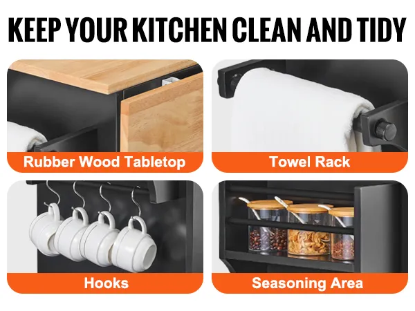 Uitgerust met een klaptafel, lades, kasten, kruidenrek en handdoekenrek biedt dit keukeneiland comfort en veel opbergruimte. Bestek, kommen en borden, kookgerei of ander keukengerei zoals broodroosters kunnen gemakkelijk worden opgeborgen.