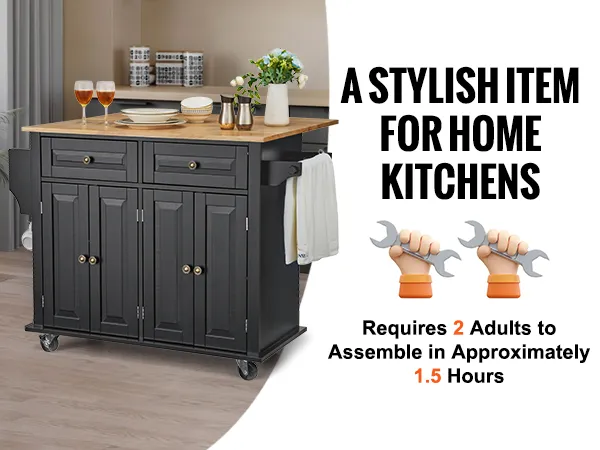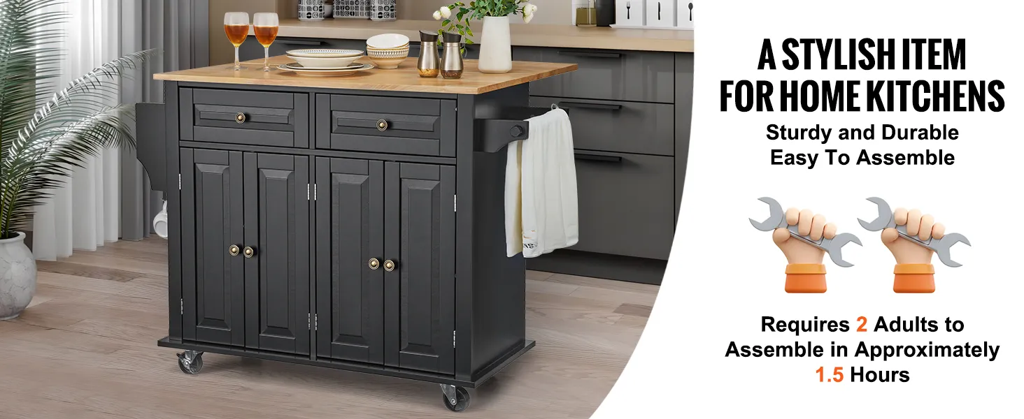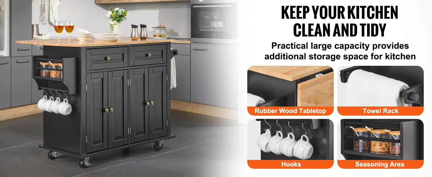 Het VEVOR keukeneiland op wielen combineert stijl met functionaliteit. De houtkleur en het zwarte design zorgen voor een moderne touch. De gouden handgrepen vullen de algehele esthetiek aan. Het verbetert niet alleen de opbergruimte, maar voegt ook stijl toe aan uw keuken. Het ontwerp is zowel praktisch als visueel aantrekkelijk. De functionaliteit doet echter geen afbreuk aan het mooie uiterlijk van de kar. U kunt deze strakke toevoeging gebruiken die naadloos integreert in elk keukeninterieur. Deze kar bewijst dat stijl en bruikbaarheid hand in hand kunnen gaan. Het is een stijlvolle en praktische keuze voor uw keukenbehoeften.