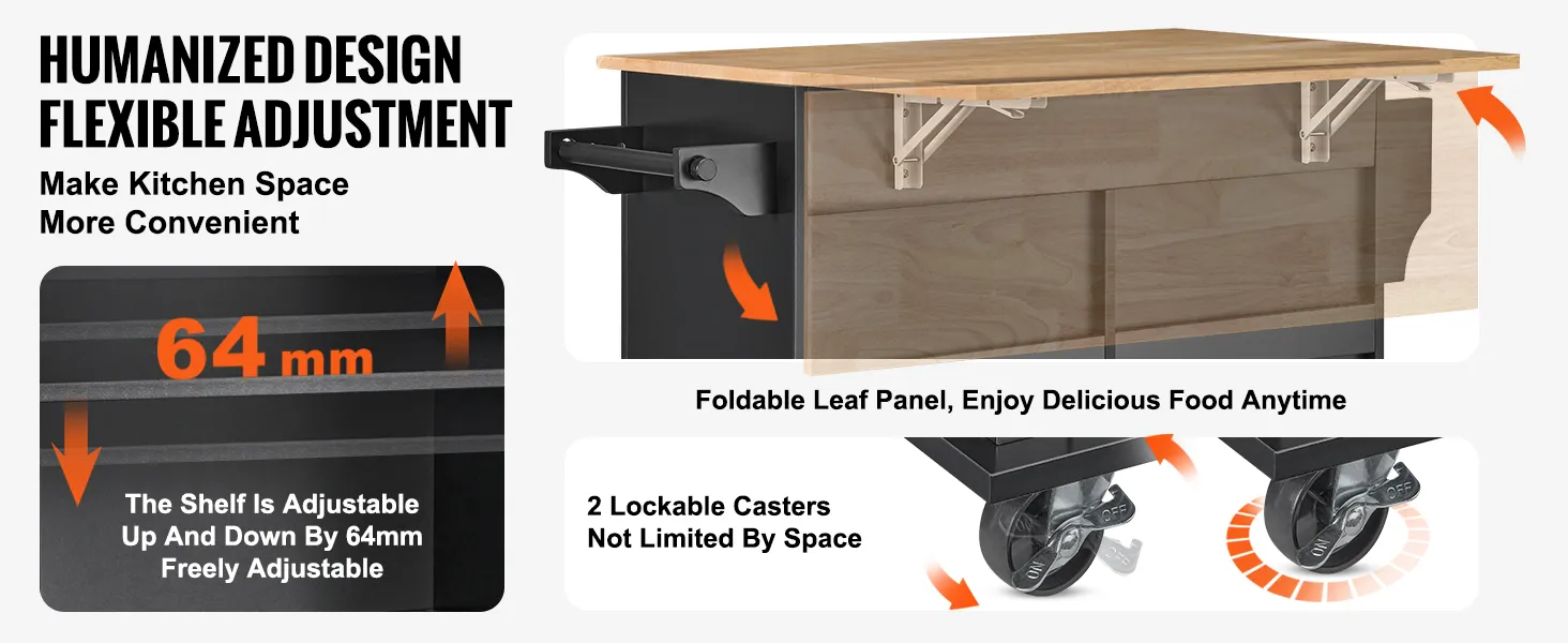 VEVOR Keukeneilandwagen, 110 cm mobiele wagen met houten blad en opbergkast, roltafel met opklapbaar blad, kruidenrek, handdoekhouder, verstelbare plank, lade en haken, draagbare eilanden oprolbaar