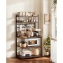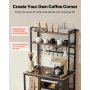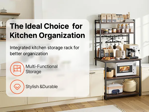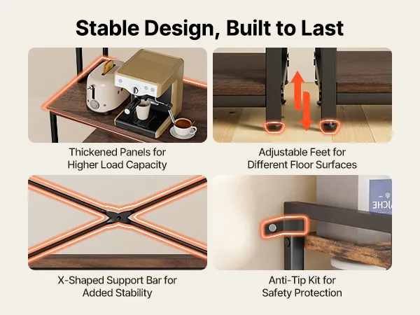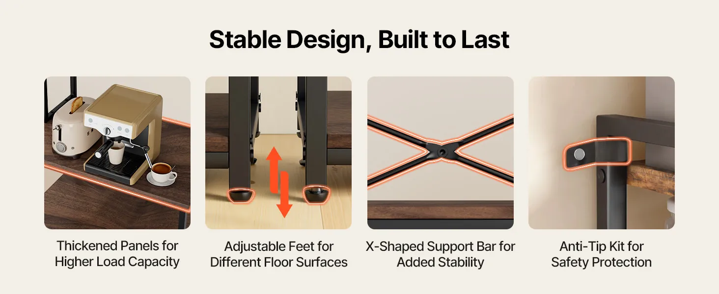 Het keukenrek heeft een verstevigd frame van ijzeren buizen en een robuust werkblad van P2-gecertificeerd spaanplaat. De in hoogte verstelbare schappen zijn geschikt voor ovens, koffiezetapparaten of opbergdozen, terwijl verstelbare poten en een anti-kantelvoorziening voor stabiliteit zorgen.
