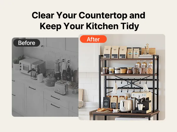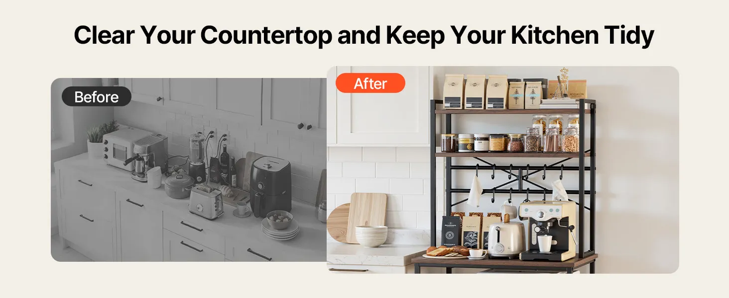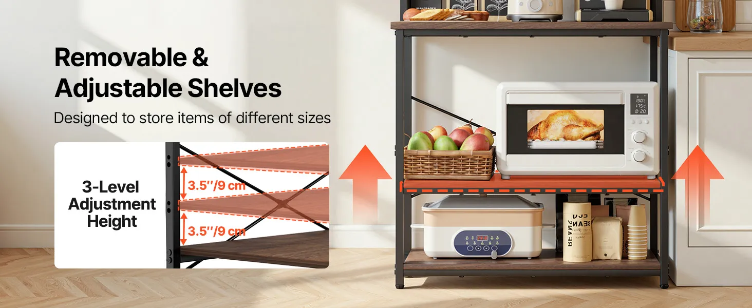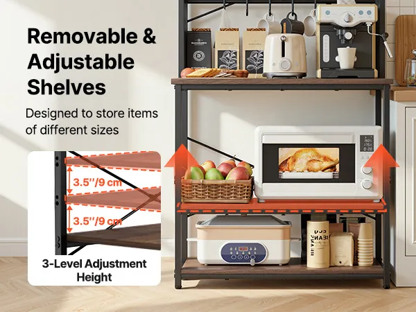 Drievoudige hoogteverstelling: Ons magnetronrek biedt efficiënte verticale opbergruimte met een werkblad voor bakgerei en apparaten. De middelste en onderste draadplanken kunnen in drie hoogtes van elk 9 cm (3,5 inch) worden versteld, voor een totale hoogte van 27 cm (10,6 inch). Dit geeft u de mogelijkheid om kookgerei, blenders en opbergbakken flexibel te plaatsen.