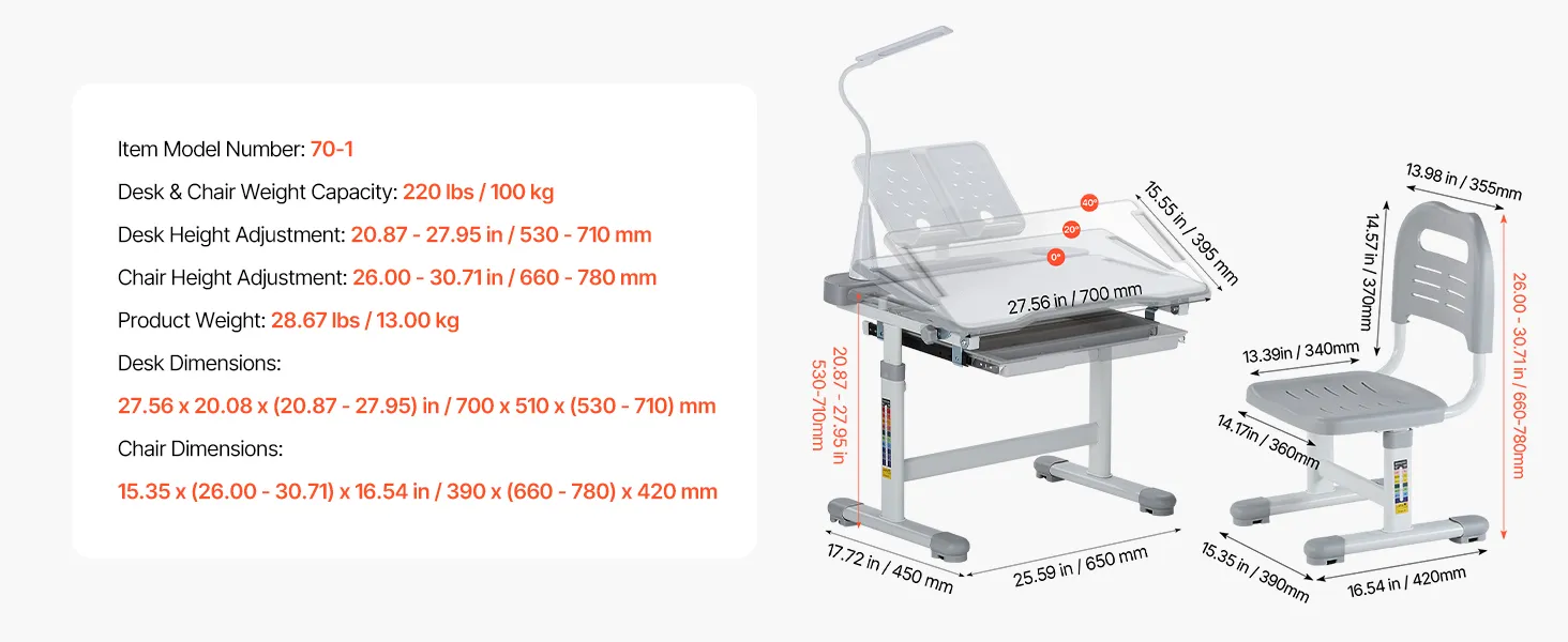 VEVOR Kids Study Chair and Desk Set, Study Desk and Chair for Kids with Table Lamp, Adjustable Height & 0-40° Tilted Desktop Kids Desk and Chair, Children Study Table for Bedroom & Study Room, Grey