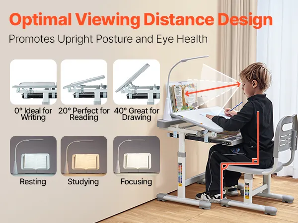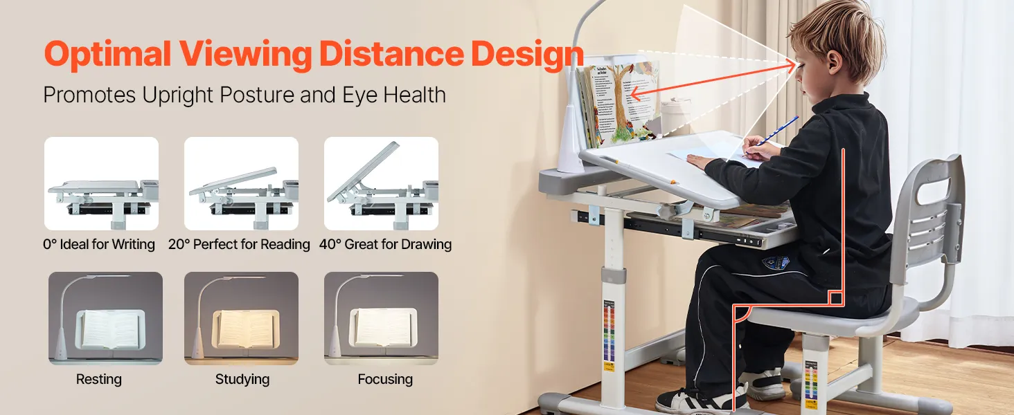Adjustable Desktop: Easily tilt the tabletop from 0° to 40°—ideal for writing at 0°, reading at 20°, or drawing at 40°. This flexibility meets various learning activities while helping your child maintain a healthy posture and stay comfortable during study time.