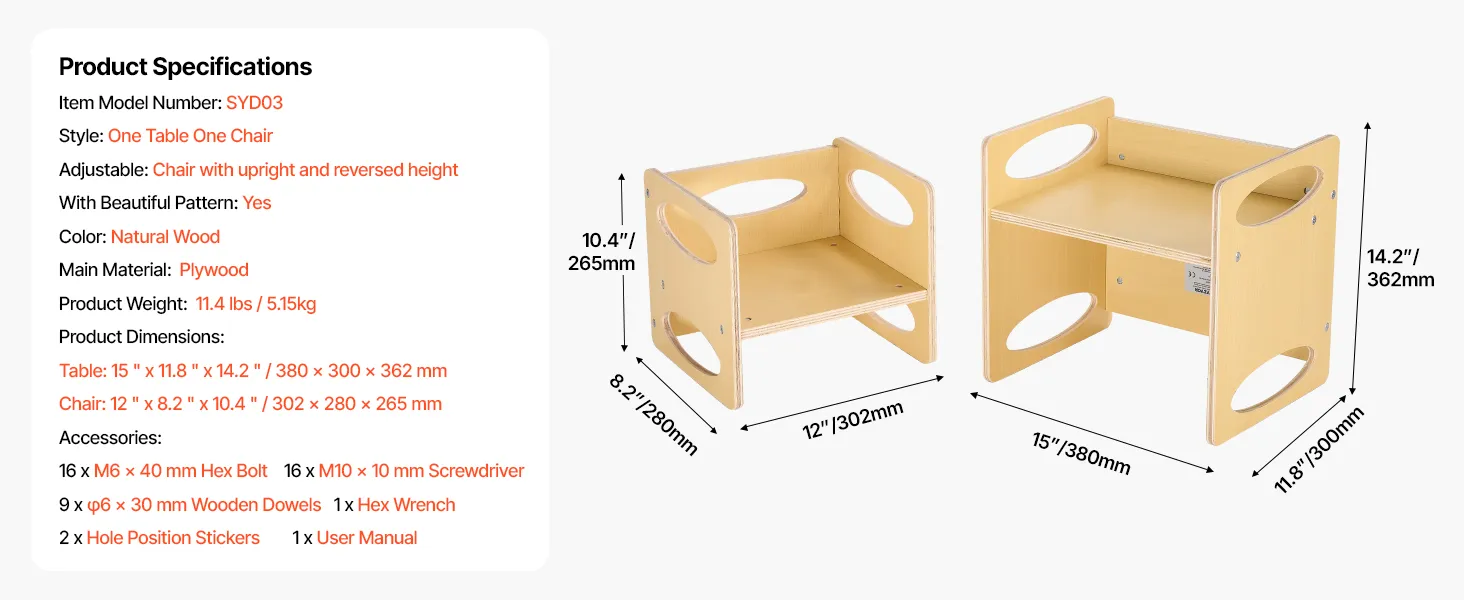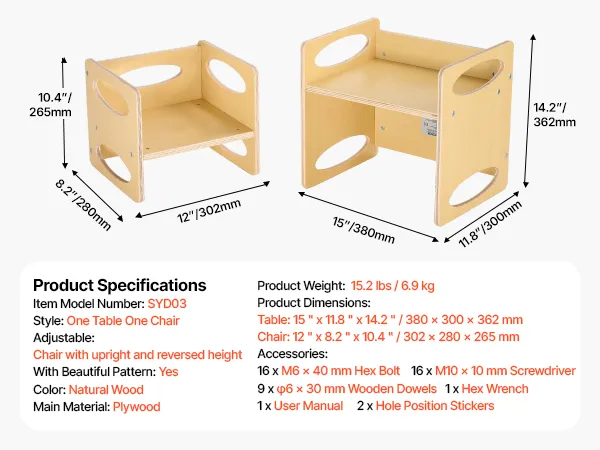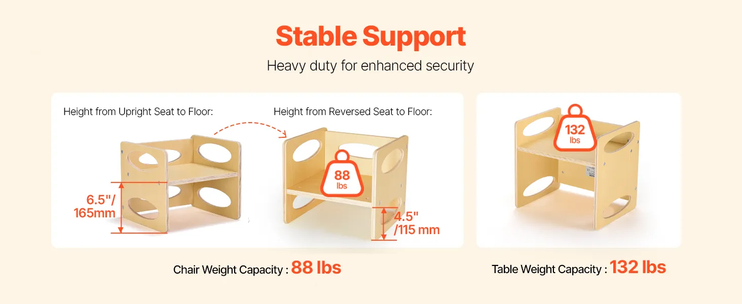 2-Level Adjustable Chair: Our toddler table and chair set has a unique reversible design, the chair offers two height options; the flat side provides a seat height of 6.5 in / 165 mm, while the reverse side offers 4.5 in / 115 mm, quickly adapting to your child's growth.