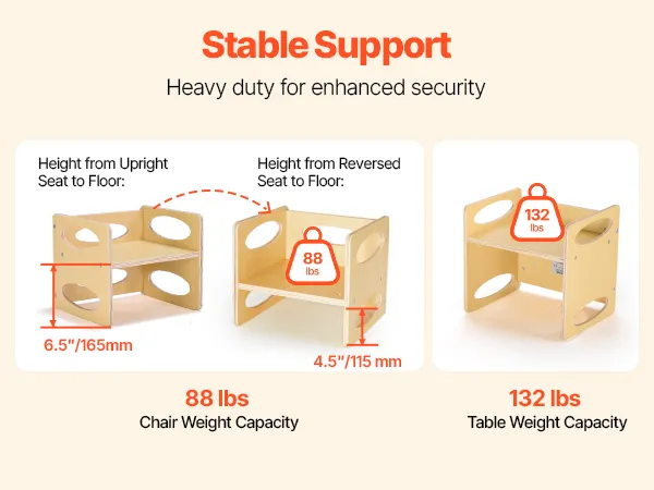 Our Montessori weaning table and chair set provides exceptional weight-bearing capacity, with the table supporting up to 132 lbs / 60 kg and the chair holding up to 88 lbs / 40 kg, ensuring stability and security for children during use.