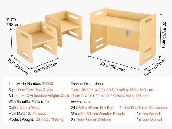 Weaning Table and Chair Set: This children's weaning table and chair set includes a table measuring 26.2 x 14.2 x 20.5 in / 665 x 360 x 520 mm and a chair measuring 11.4 x 11.7 x 11.7 in / 290 x 298 x 298 mm. Featuring creative patterns, it offers three adjustable height options and is made from durable materials. The tabletop is easily interchangeable, creating a multifunctional growth environment for your child.