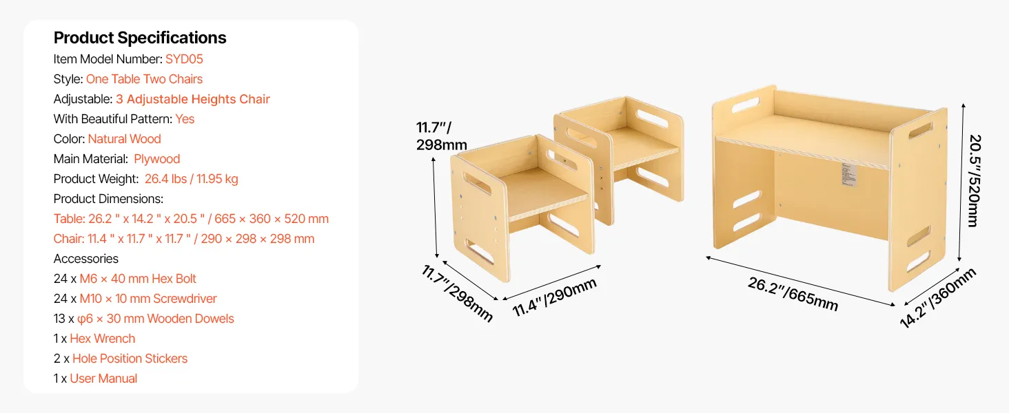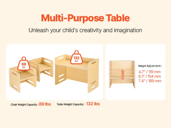 Adjustable Height: Our children's Montessori weaning table and chair set offers three height adjustment options (4.7 in / 119 mm, 6.1 in / 154 mm, 7.4 in / 189 mm) to accommodate your child’s needs at various growth stages.