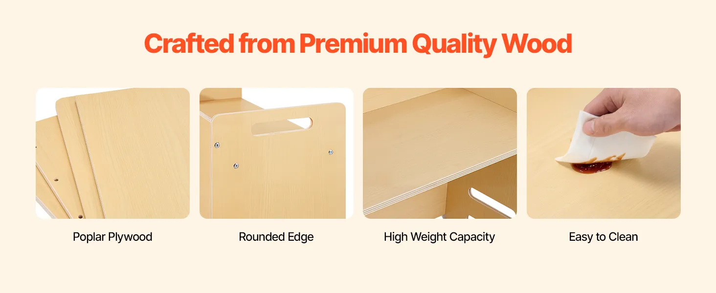Made from durable plywood, this Montessori furniture features rounded corners to reduce injury risks. Its strong weight capacity and easy-to-clean surface ensure convenience, security, and stability for your child.