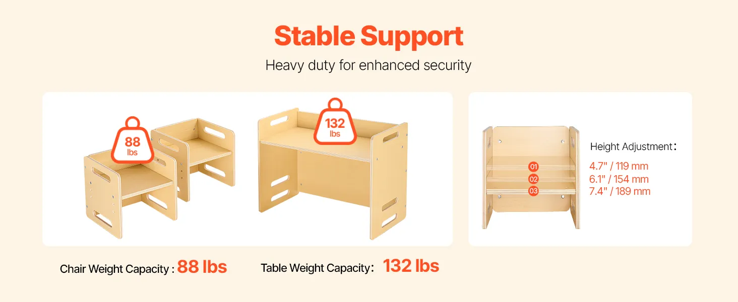 Our Montessori weaning table and chair set provides exceptional weight-bearing capacity, with the table supporting up to 132 lbs / 60 kg and the chair holding up to 88 lbs / 40 kg, ensuring stability and security for children during use.