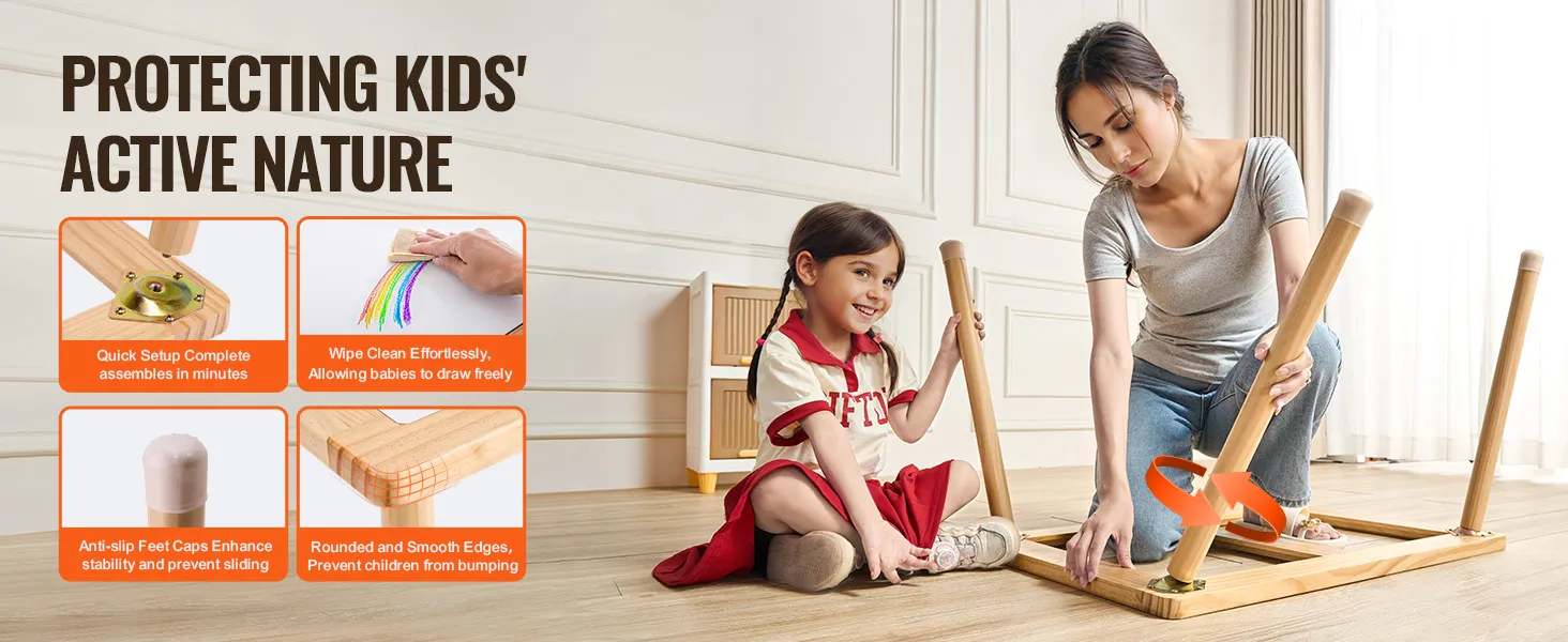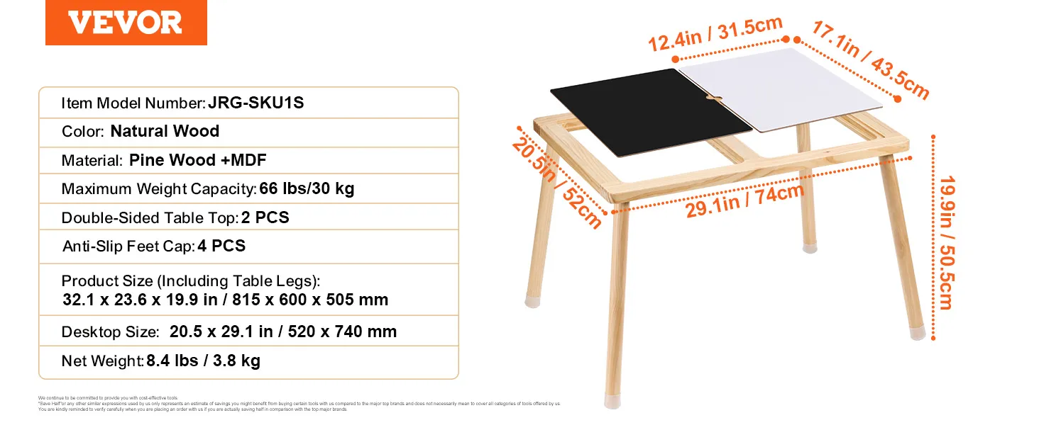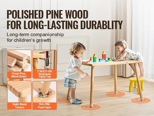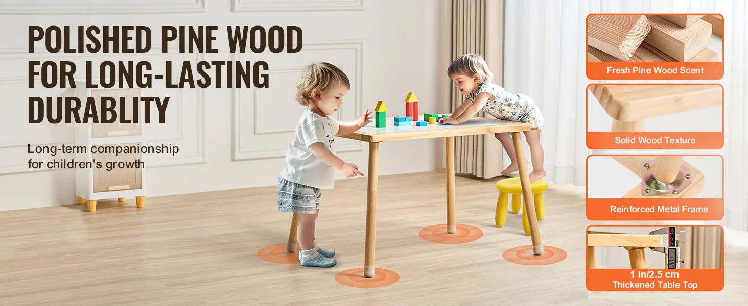 Het tafelblad en de poten van onze kinderspeeltafel zijn gemaakt van hoogwaardig grenenhout, glad geschuurd en zonder scherpe randen of bramen. Het 2,5 cm dikke tafelblad kan tot 30 kg dragen en groeit mee met je kind.