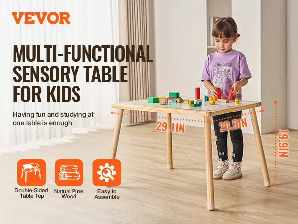 De sensorische tafel is gemaakt van hoogwaardig grenenhout, heeft gladde, afgeronde hoeken en is gelakt voor extra veiligheid. Met zijn twee dubbelzijdige tafelbladen bevordert hij de creativiteit en het leren van uw kind en is hij ideaal voor lezen, tekenen, enz.