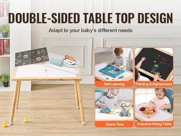Het is dubbelzijdig en heeft twee tafelbladen (een als whiteboard, de ander als schoolbord) waar kinderen hun maaltijden en snacks kunnen nuttigen, boeken kunnen lezen, huiswerk kunnen maken, spelletjes kunnen doen en kunnen schilderen.
