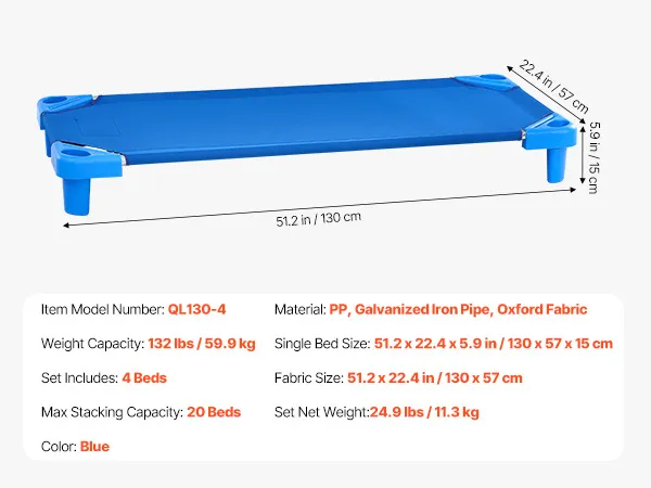 Deze stapelbare bedjes hebben een stevig gegalvaniseerd stalen frame en afgeronde PP-hoeken en zijn ontworpen om uw kleintjes veilig en beschermd te houden tijdens hun dutje. U hoeft zich geen zorgen te maken: dit bed is gebouwd om lang mee te gaan.